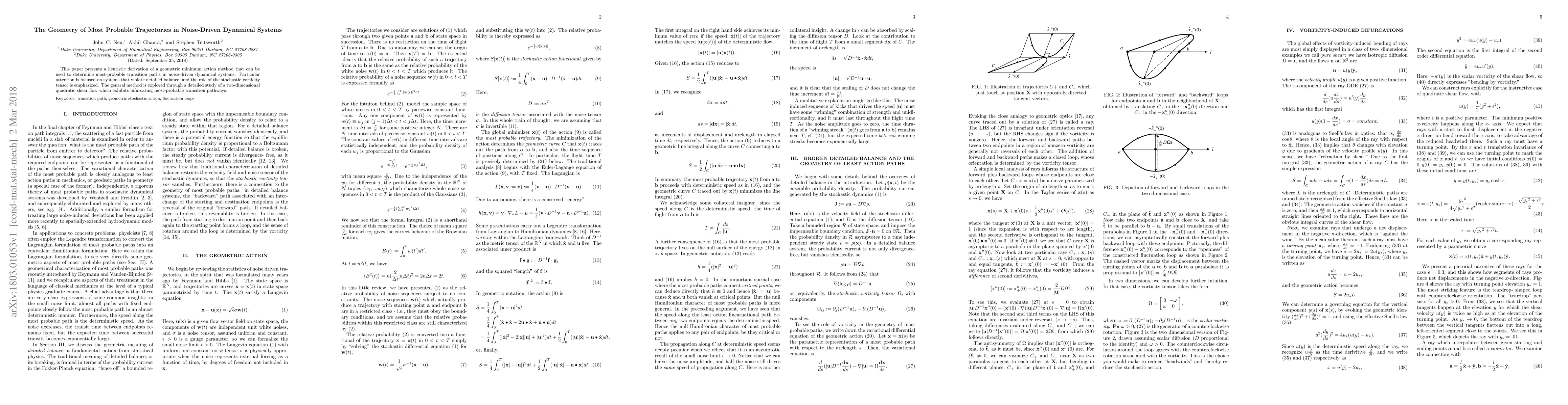 This paper presents a heuristic derivation of a geometric minimum action method that can be used to determine most-probable transition paths in noise-driven dynamical systems. Particular attention is focused on systems that violate detailed balance, and the role of the stochastic vorticity tensor is emphasized. The general method is explored through a detailed study of a two-dimensional quadratic shear flow which exhibits bifurcating most-probable transition pathways.