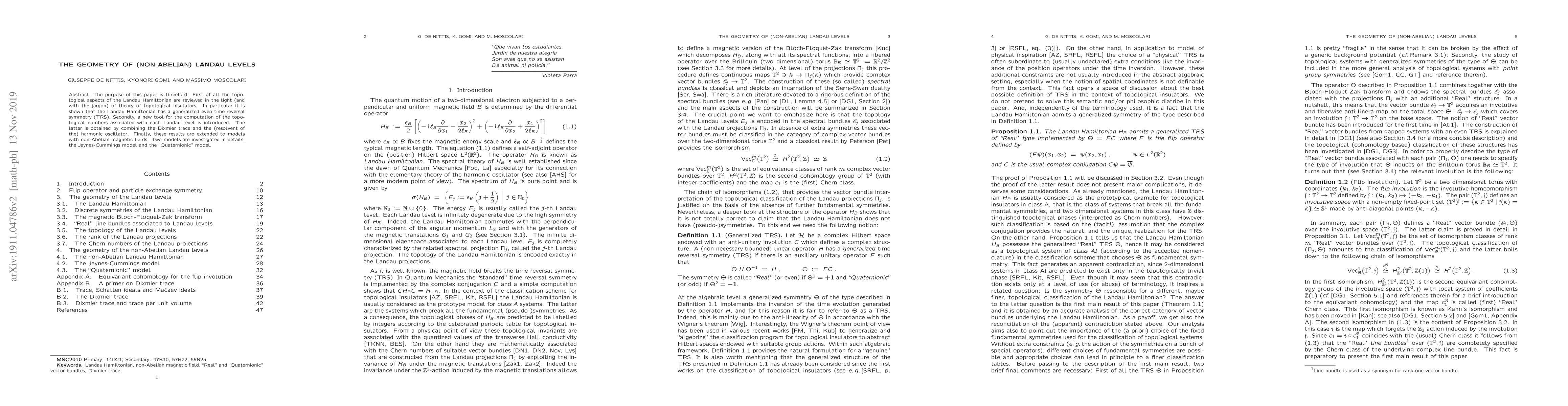 The purpose of this paper is threefold: First of all the topological aspects of the Landau Hamiltonian are reviewed in the light (and with the jargon) of theory of topological insulators. In particular it is shown that the Landau Hamiltonian has a generalized even time-reversal symmetry (TRS). Secondly, a new tool for the computation of the topological numbers associated with each Landau level is introduced. The latter is obtained by combining the Dixmier trace and the (resolvent of the) harmonic oscillator. Finally, these results are extended to models with non-Abelian magnetic fields. Two models are investigated in details: the Jaynes-Cummings model and the "Quaternionic" model.