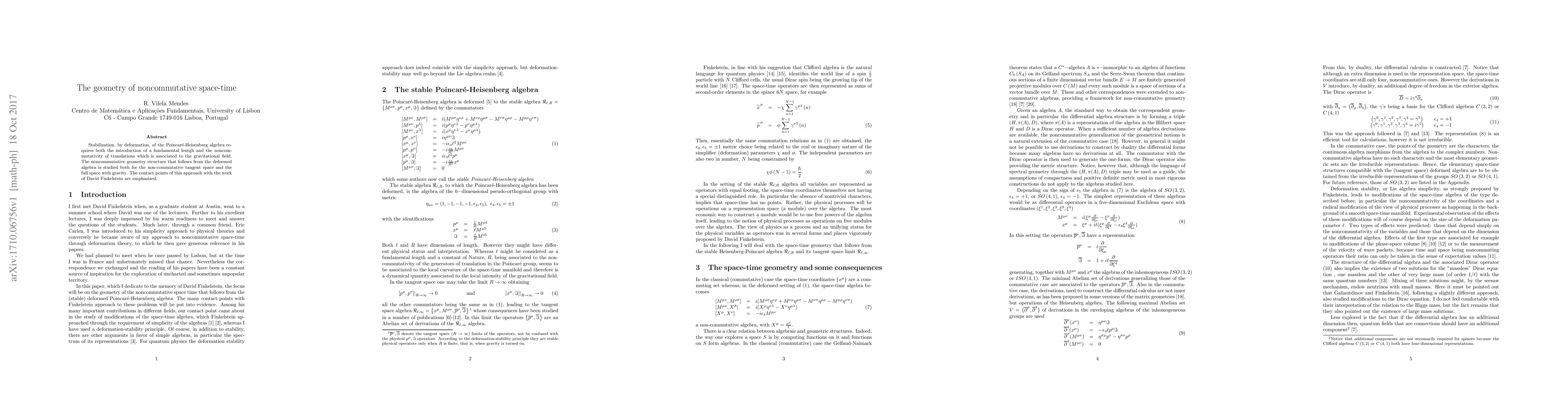 Stabilization, by deformation, of the Poincar\'{e}-Heisenberg algebra requires both the introduction of a fundamental lentgh and the noncommutativity of translations which is associated to the gravitational field. The noncommutative geometry structure that follows from the deformed algebra is studied both for the non-commutative tangent space and the full space with gravity. The contact points of this approach with the work of David Finkelstein are emphasized.