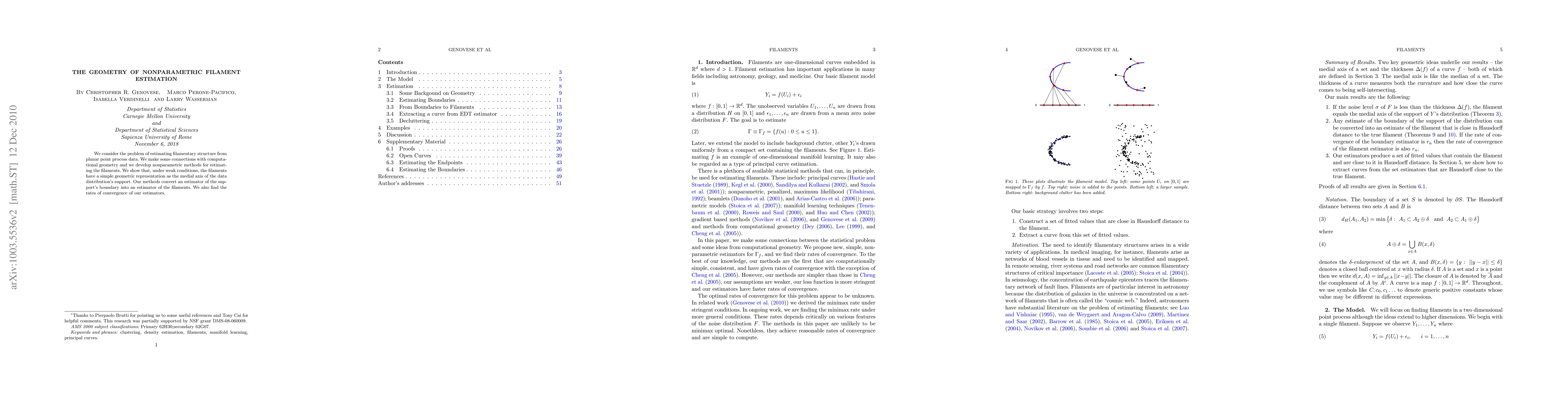 We consider the problem of estimating filamentary structure from planar point process data. We make some connections with computational geometry and we develop nonparametric methods for estimating the filaments. We show that, under weak conditions, the filaments have a simple geometric representation as the medial axis of the data distribution's support. Our methods convert an estimator of the support's boundary into an estimator of the filaments. We also find the rates of convergence of our estimators.