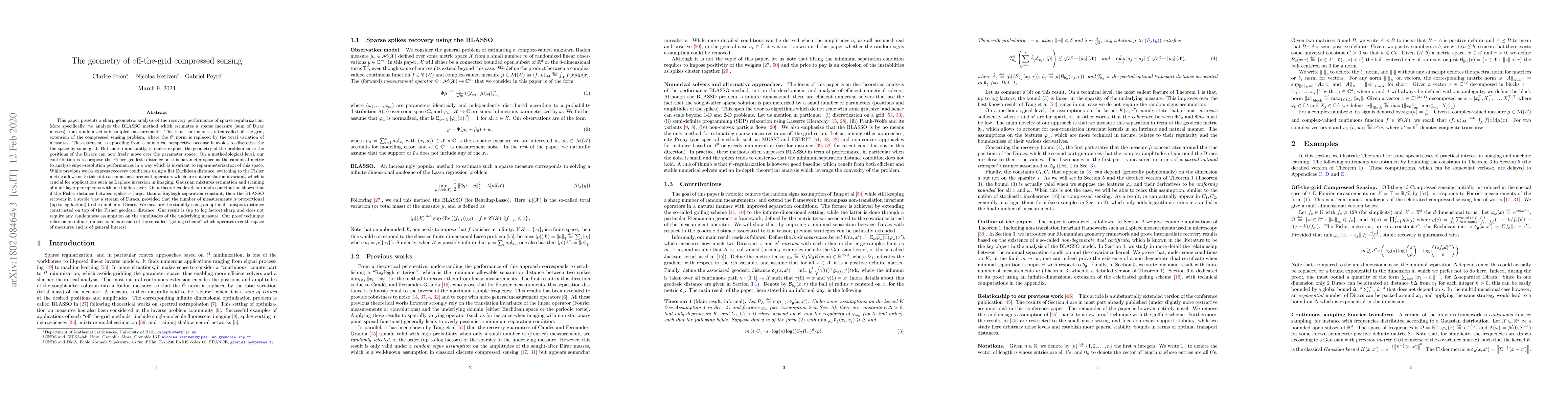 This paper presents a sharp geometric analysis of the recovery performance of sparse regularization. More specifically, we analyze the BLASSO method which estimates a sparse measure (sum of Dirac masses) from randomized sub-sampled measurements. This is a "continuous", often called off-the-grid, extension of the compressed sensing problem, where the $\ell^1$ norm is replaced by the total variation of measures. This extension is appealing from a numerical perspective because it avoids to discretize the the space by some grid. But more importantly, it makes explicit the geometry of the problem since the positions of the Diracs can now freely move over the parameter space. On a methodological level, our contribution is to propose the Fisher geodesic distance on this parameter space as the canonical metric to analyze super-resolution in a way which is invariant to reparameterization of this space. Switching to the Fisher metric allows us to take into account measurement operators which are not translation invariant, which is crucial for applications such as Laplace inversion in imaging, Gaussian mixtures estimation and training of multilayer perceptrons with one hidden layer. On a theoretical level, our main contribution shows that if the Fisher distance between spikes is larger than a Rayleigh separation constant, then the BLASSO recovers in a stable way a stream of Diracs, provided that the number of measurements is proportional (up to log factors) to the number of Diracs. We measure the stability using an optimal transport distance constructed on top of the Fisher geodesic distance. Our result is (up to log factor) sharp and does not require any randomness assumption on the amplitudes of the underlying measure. Our proof technique relies on an infinite-dimensional extension of the so-called "golfing scheme" which operates over the space of measures and is of general interest.