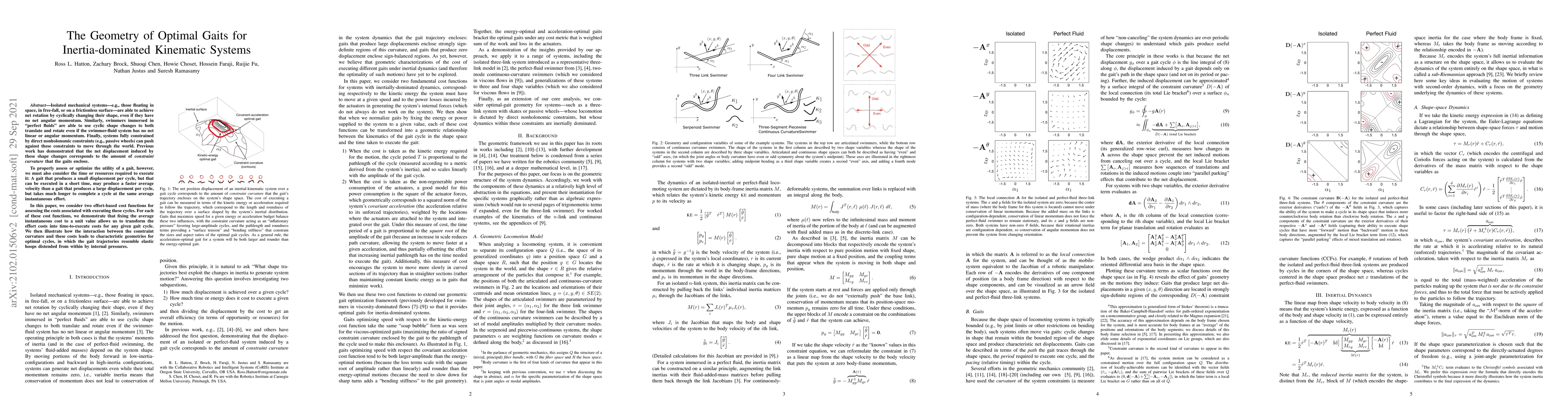 Isolated mechanical systems -- e.g., those floating in space, in free-fall, or on a frictionless surface -- are able to achieve net rotation by cyclically changing their shape, even if they have no net angular momentum. Similarly, swimmers immersed in "perfect fluids" are able to use cyclic shape changes to both translate and rotate even if the swimmer-fluid system has no net linear or angular momentum. Finally, systems fully constrained by direct nonholonomic constraints (e.g., passive wheels) can push against these constraints to move through the world. Previous work has demonstrated that the net displacement induced by these shape changes corresponds to the amount of *constraint curvature* that the gaits enclose. To properly assess or optimize the utility of a gait, however, we must also consider the time or resources required to execute it: A gait that produces a small displacement per cycle, but that can be executed in a short time, may produce a faster average velocity than a gait that produces a large displacement per cycle, but takes much longer to complete a cycle at the same average instantaneous effort. In this paper, we consider two effort-based cost functions for assessing the costs associated with executing these cycles. For each of these cost functions, we demonstrate that fixing the average instantaneous cost to a unit value allows us to transform the effort costs into time-to-execute costs for any given gait cycle. We then illustrate how the interaction between the constraint curvature and these costs leads to characteristic geometries for optimal cycles, in which the gait trajectories resemble elastic hoops distended from within by internal pressures.