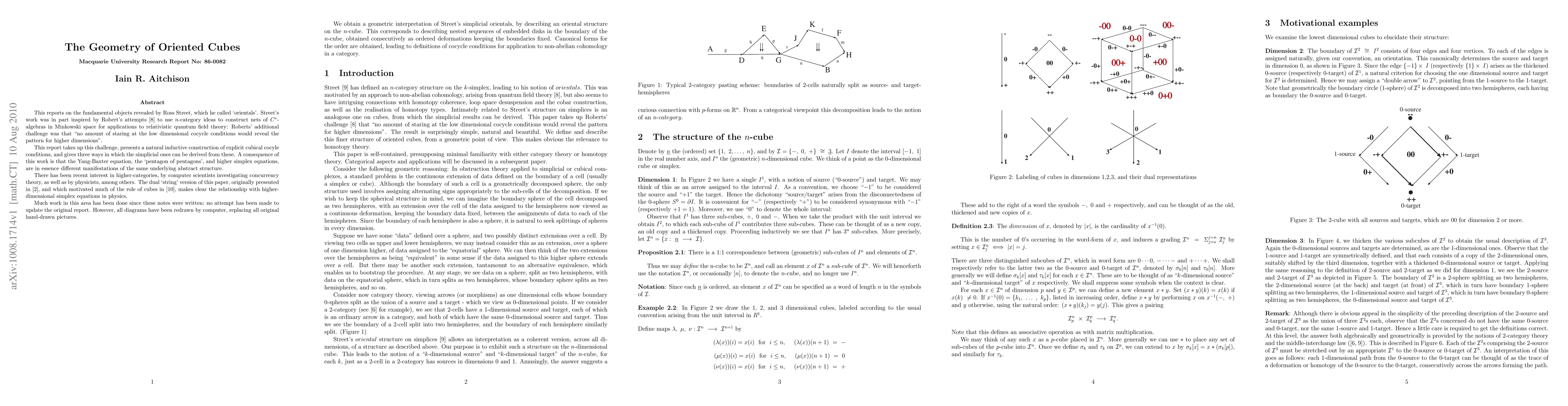 This reports on the fundamental objects revealed by Ross Street, which he called `orientals'. Street's work was in part inspired by Robert's attempts to use N-category ideas to construct nets of C*-algebras in Minkowski space for applications to relativistic quantum field theory: Roberts' additional challenge was that `no amount of staring at the low dimensional cocycle conditions would reveal the pattern for higher dimensions'. This report takes up this challenge, presenting a natural inductive construction of explicit cubical cocyle conditions, and gives three ways in which the simplicial ones can be derived from these. (A dual string-diagram version of this work, giving rise to a Pascal's triangle of diagrams for cocycle conditions, has been described elsewhere by Street). A consequence of this work is that the Yang-Baxter equation, the `pentagon of pentagons', and higher simplex equations, are in essence different manifestations of the same underlying abstract structure. There has been recent interest in higher-categories, by computer scientists investigating concurrency theory, as well as by physicists, among others. The dual `string' version of this paper makes clear the relationship with higher-dimensional simplex equations in physics. Much work in this area has been done since these notes were written: no attempt has been made to update the original report. However, all diagrams have been redrawn by computer, replacing all original hand-drawn pictures.