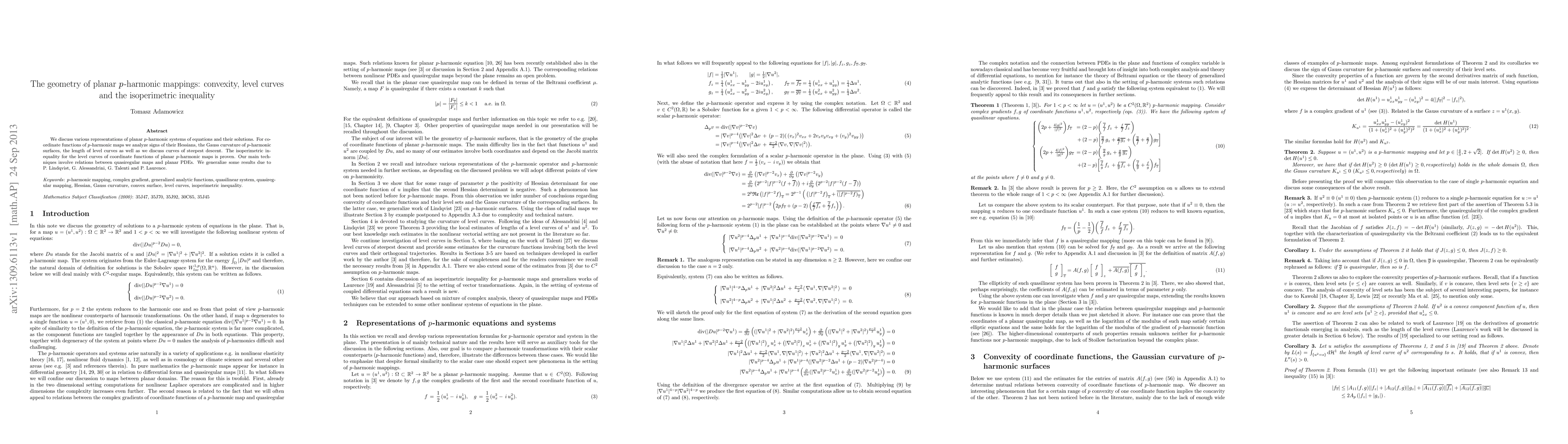 We discuss various representations of planar $p$-harmonic systems of equations and their solutions. For coordinate functions of $p$-harmonic maps we analyze signs of their Hessians, the Gauss curvature of $p$-harmonic surfaces, the length of level curves as well as we discuss curves of steepest descent. The isoperimetric inequality for the level curves of coordinate functions of planar $p$-harmonic maps is proven. Our main techniques involve relations between quasiregular maps and planar PDEs. We generalize some results due to P. Lindqvist, G. Alessandrini, G. Talenti and P. Laurence.