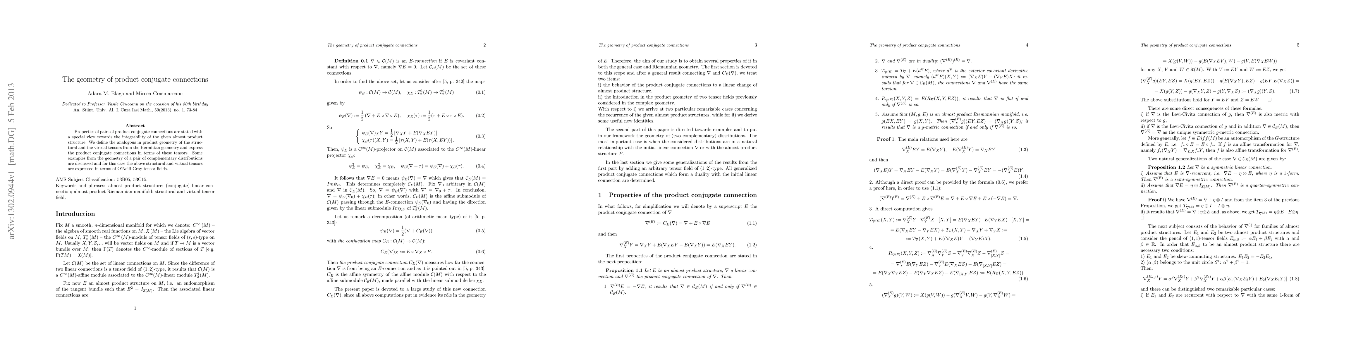Properties of pairs of product conjugate connections are stated with a special view towards the integrability of the given almost product structure. We define the analogous in product geometry of the structural and the virtual tensors from the Hermitian geometry and express the product conjugate connections in terms of these tensors. Some examples from the geometry of a pair of complementary distributions are discussed and for this case the above structural and virtual tensors are expressed in terms of O'Neill-Gray tensor fields.
