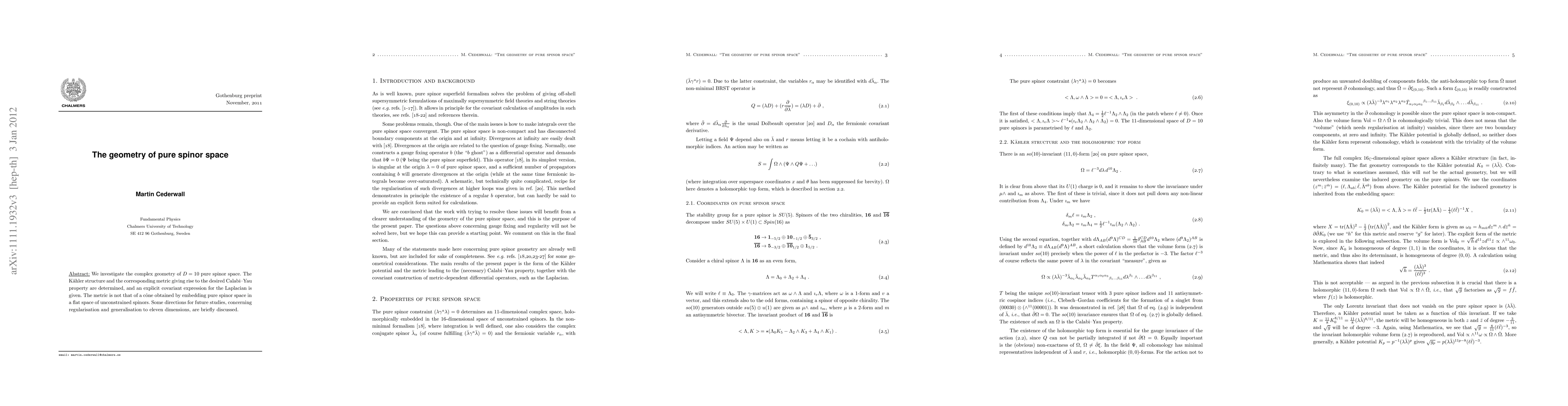 This paper explores the complex geometry of D=10 pure spinor space, determining its Kähler structure and Calabi-Yau metric, and provides an explicit covariant Laplacian expression. It concludes by noting the metric differs from a cone in flat space and suggests future work on regularization and extension to eleven dimensions.