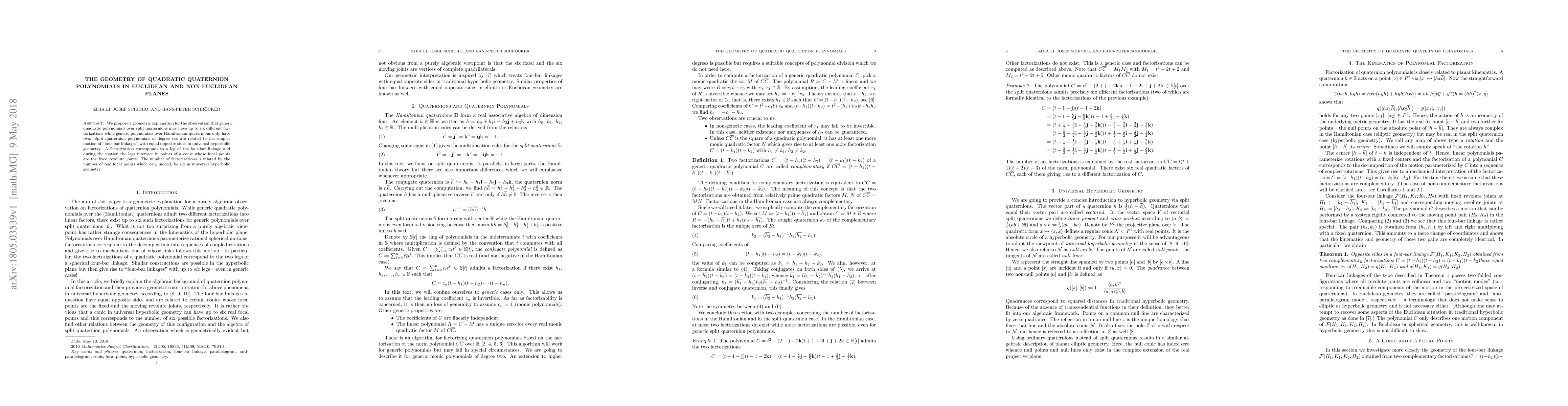 We propose a geometric explanation for the observation that generic quadratic polynomials over split quaternions may have up to six different factorizations while generic polynomials over Hamiltonian quaternions only have two. Split quaternion polynomials of degree two are related to the coupler motion of "four-bar linkages" with equal opposite sides in universal hyperbolic geometry. A factorization corresponds to a leg of the four-bar linkage and during the motion the legs intersect in points of a conic whose focal points are the fixed revolute joints. The number of factorizations is related by the number of real focal points which can, indeed, be six in universal hyperbolic geometry.