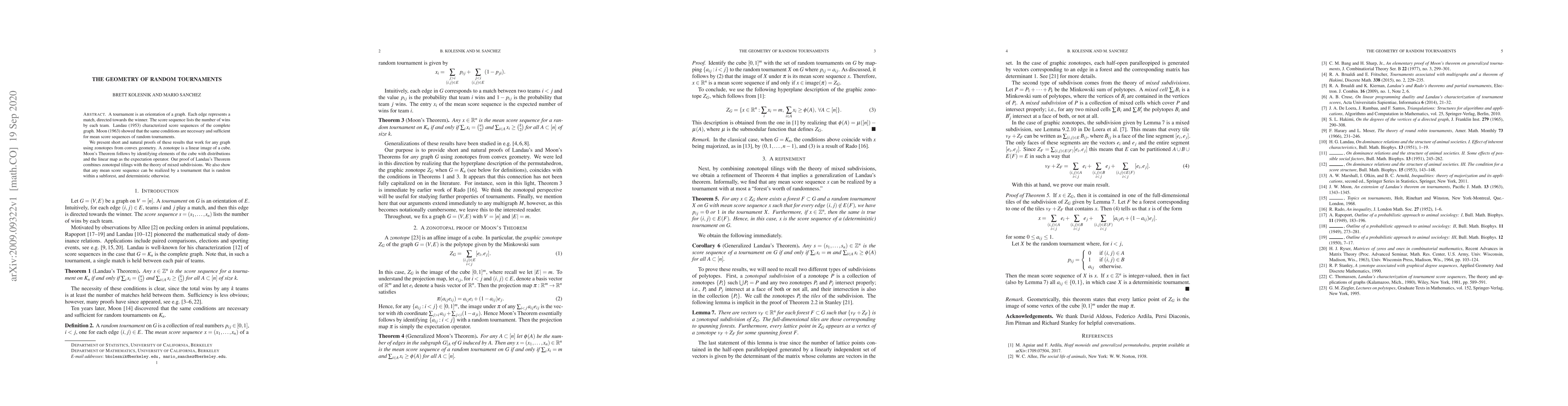A tournament is an orientation of a graph. Each edge represents a match, directed towards the winner. The score sequence lists the number of wins by each team. Landau (1953) characterized score sequences of the complete graph. Moon (1963) showed that the same conditions are necessary and sufficient for mean score sequences of random tournaments. We present short and natural proofs of these results that work for any graph using zonotopes from convex geometry. A zonotope is a linear image of a cube. Moon's Theorem follows by identifying elements of the cube with distributions and the linear map as the expectation operator. Our proof of Landau's Theorem combines zonotopal tilings with the theory of mixed subdivisions. We also show that any mean score sequence can be realized by a tournament that is random within a subforest, and deterministic otherwise.