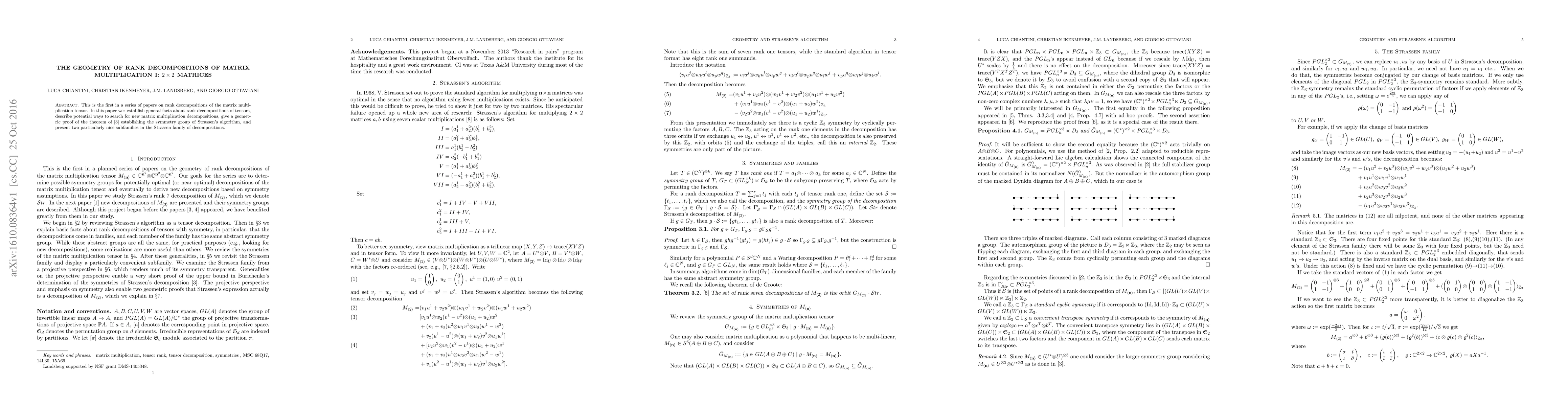 This paper explores rank decompositions of matrix multiplication tensors, focusing on 2x2 matrices, and provides a geometric proof for the symmetry group of Strassen's algorithm, along with two notable subfamilies within the Strassen decompositions.