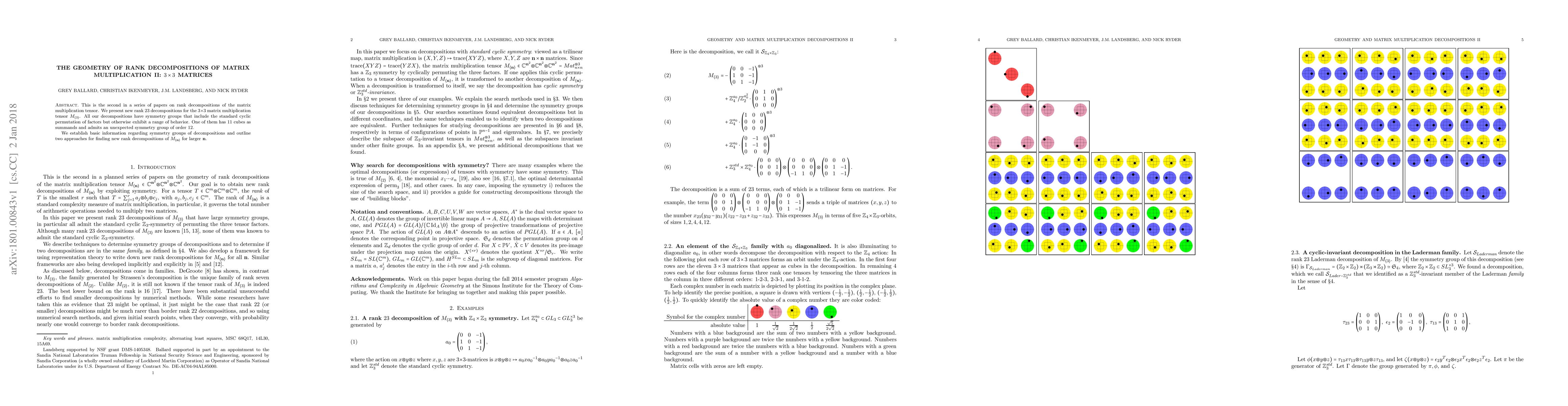 This paper presents new rank 23 decompositions for the $3\times 3$ matrix multiplication tensor, including one with a symmetry group of order 12 and 11 cubes as summands. It also outlines methods for finding rank decompositions for larger matrices.