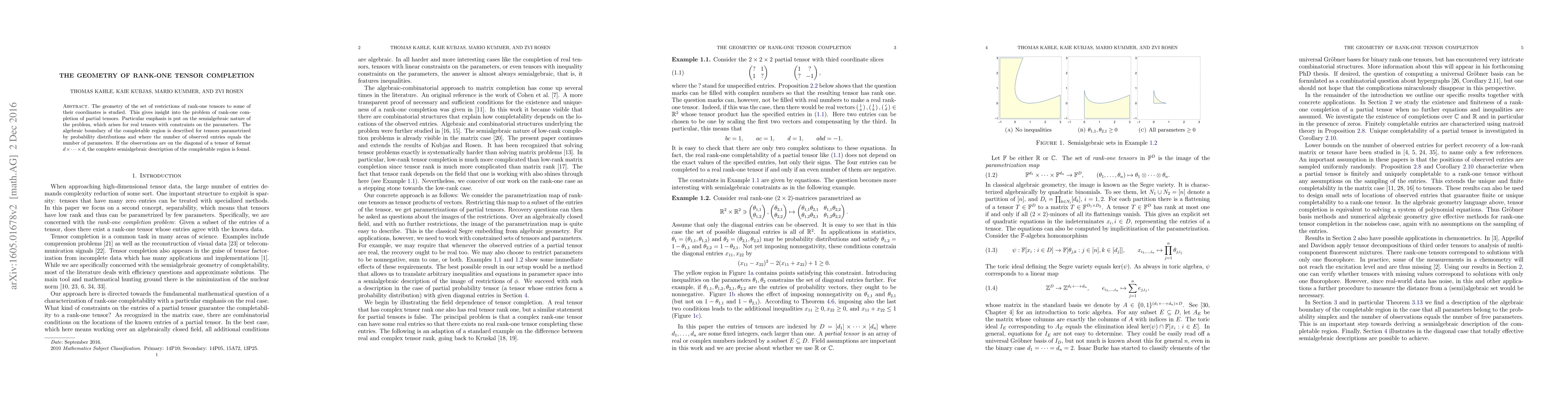 This paper explores the geometry of rank-one tensor completion, focusing on the semialgebraic constraints that arise when completing partial tensors. It provides a complete semialgebraic description of the completable region for diagonal observations in tensors of equal dimensions.