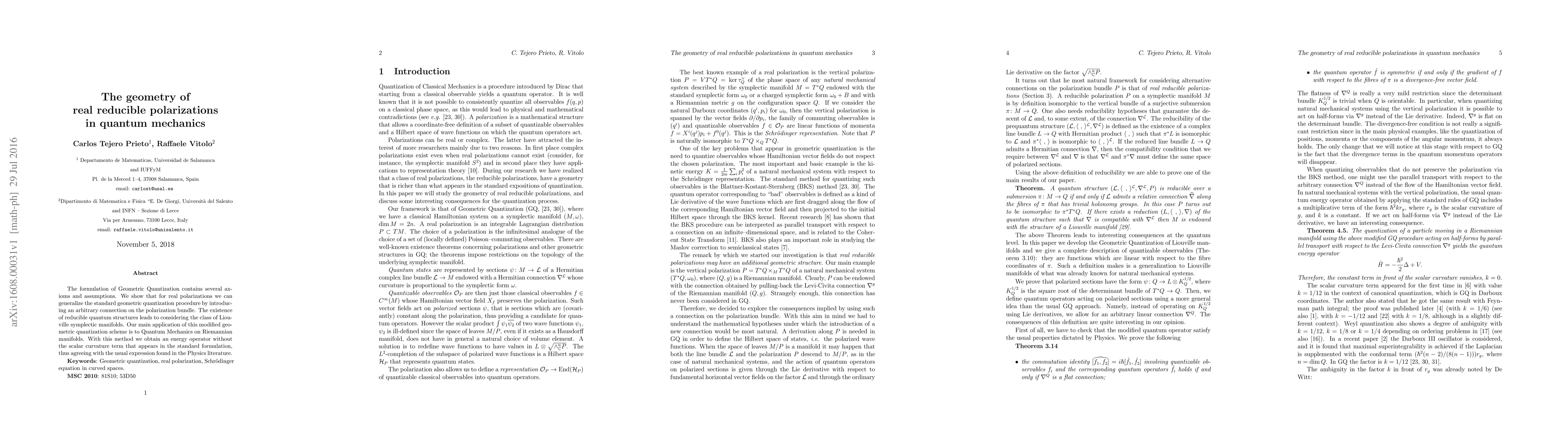 The formulation of Geometric Quantization contains several axioms and assumptions. We show that for real polarizations we can generalize the standard geometric quantization procedure by introducing an arbitrary connection on the polarization bundle. The existence of reducible quantum structures leads to considering the class of Liouville symplectic manifolds. Our main application of this modified geometric quantization scheme is to Quantum Mechanics on Riemannian manifolds. With this method we obtain an energy operator without the scalar curvature term that appears in the standard formulation, thus agreeing with the usual expression found in the Physics literature.