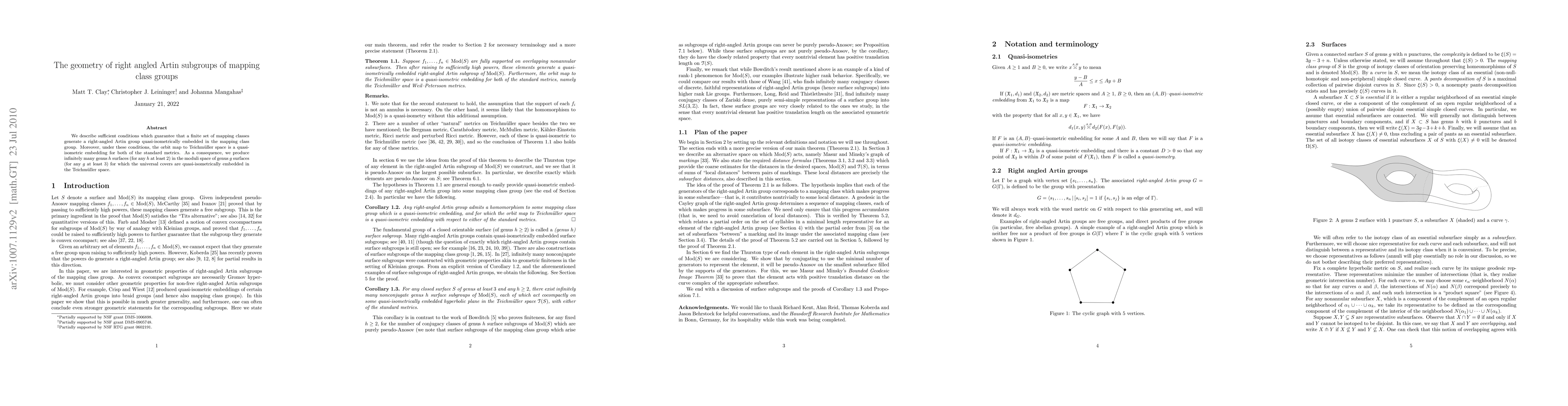 We describe sufficient conditions which guarantee that a finite set of mapping classes generate a right-angled Artin group quasi-isometrically embedded in the mapping class group. Moreover, under these conditions, the orbit map to Teichmuller space is a quasi-isometric embedding for both of the standard metrics. As a consequence, we produce infinitely many genus h surfaces (for any h at least 2) in the moduli space of genus g surfaces (for any g at least 3) for which the universal covers are quasi-isometrically embedded in the Teichmuller space.