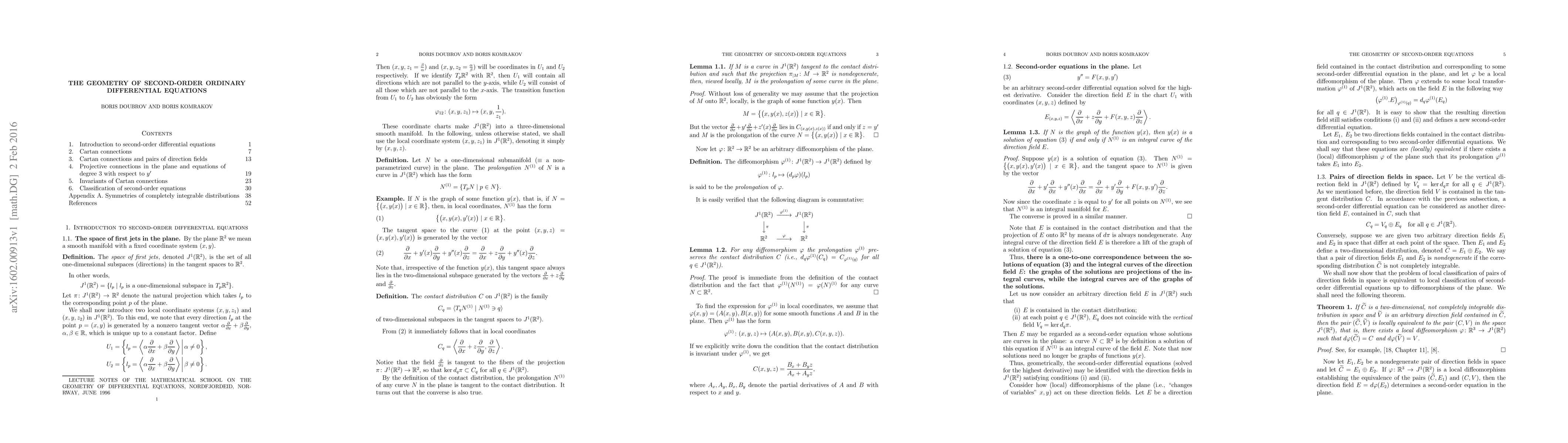 These lecture notes explore the geometric structures of scalar second-order ordinary differential equations (ODEs), focusing on Cartan connections, invariant computation techniques, and the recognition of symmetric equations via differential invariants. They also address the local equivalence problem in differential equations.