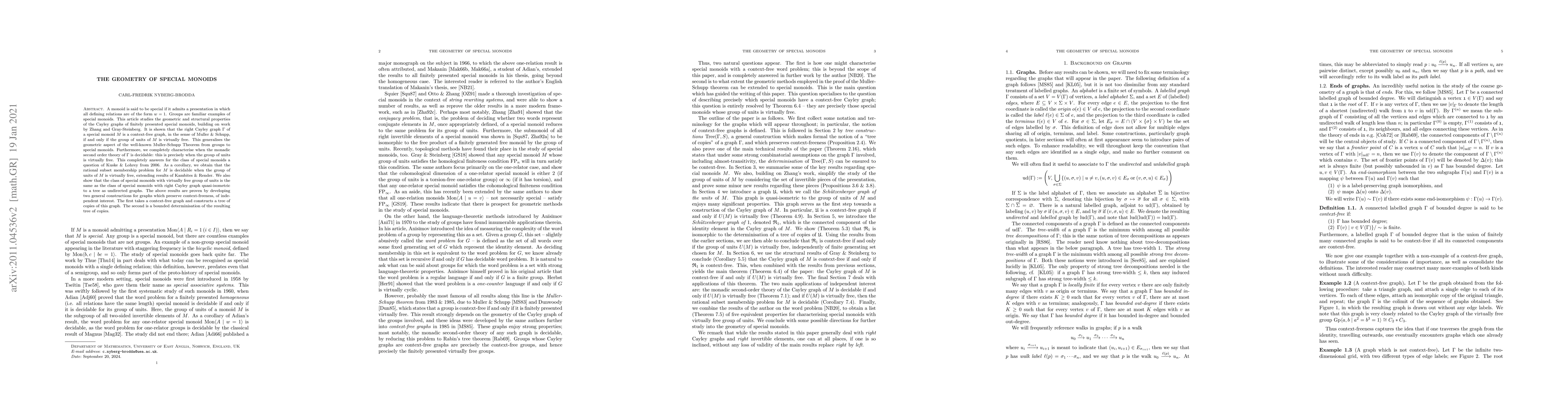 A monoid is said to be special if it admits a presentation in which all defining relations are of the form $w = 1$. Groups are familiar examples of special monoids. This article studies the geometric and structural properties of the Cayley graphs of finitely presented special monoids, building on work by Zhang and Gray-Steinberg. It is shown that the right Cayley graph $\Gamma$ of a special monoid $M$ is a context-free graph, in the sense of Muller & Schupp, if and only if the group of units of $M$ is virtually free. This generalises the geometric aspect of the well-known Muller-Schupp Theorem from groups to special monoids. Furthermore, we completely characterise when the monadic second order theory of $\Gamma$ is decidable: this is precisely when the group of units is virtually free. This completely answers for the class of special monoids a question of Kuske & Lohrey from 2006. As a corollary, we obtain that the rational subset membership problem for $M$ is decidable when the group of units of $M$ is virtually free, extending results of Kambites & Render. We also show that the class of special monoids with virtually free group of units is the same as the class of special monoids with right Cayley graph quasi-isometric to a tree as undirected graphs. The above results are proven by developing two general constructions for graphs which preserve context-freeness, of independent interest. The first takes a context-free graph and constructs a tree of copies of this graph. The second is a bounded determinisation of the resulting tree of copies.