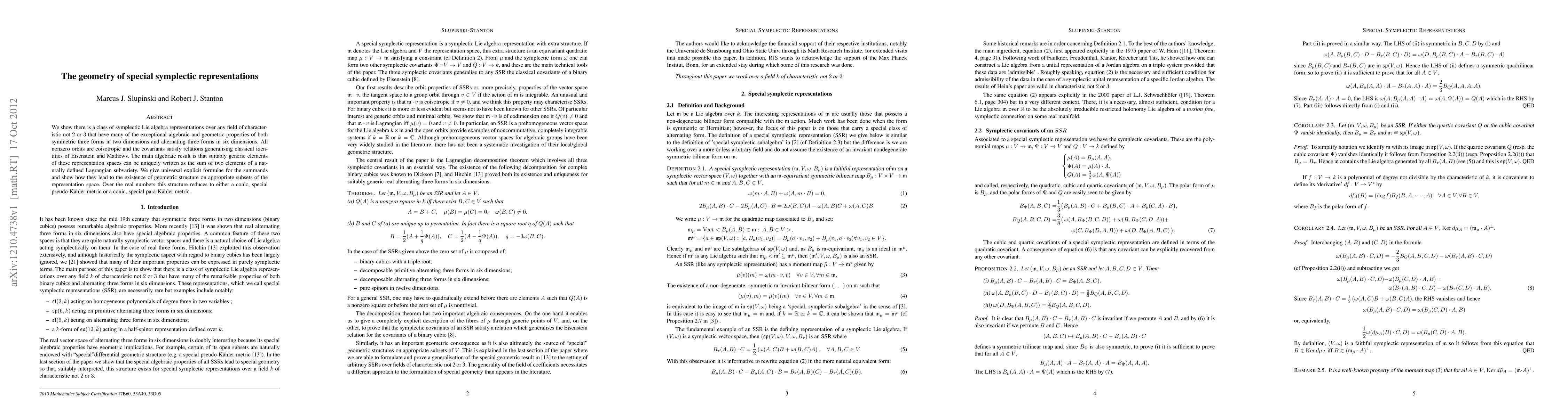 We show there is a class of symplectic Lie algebra representations over any field of characteristic not 2 or 3 that have many of the exceptional algebraic and geometric properties of both symmetric three forms in two dimensions and alternating three forms in six dimensions. All nonzero orbits are coisotropic and the covariants satisfy relations generalising classical identities of Eisenstein and Mathews. The main algebraic result is that suitably generic elements of these representation spaces can be uniquely written as the sum of two elements of a naturally defined Lagrangian subvariety. We give universal explicit formulae for the summands and show how they lead to the existence of geometric structure on appropriate subsets of the representation space. Over the reals this structure reduces to either a conic, special pseudo-K\" ahler metric or a conic, special para-K\" ahler metric.
