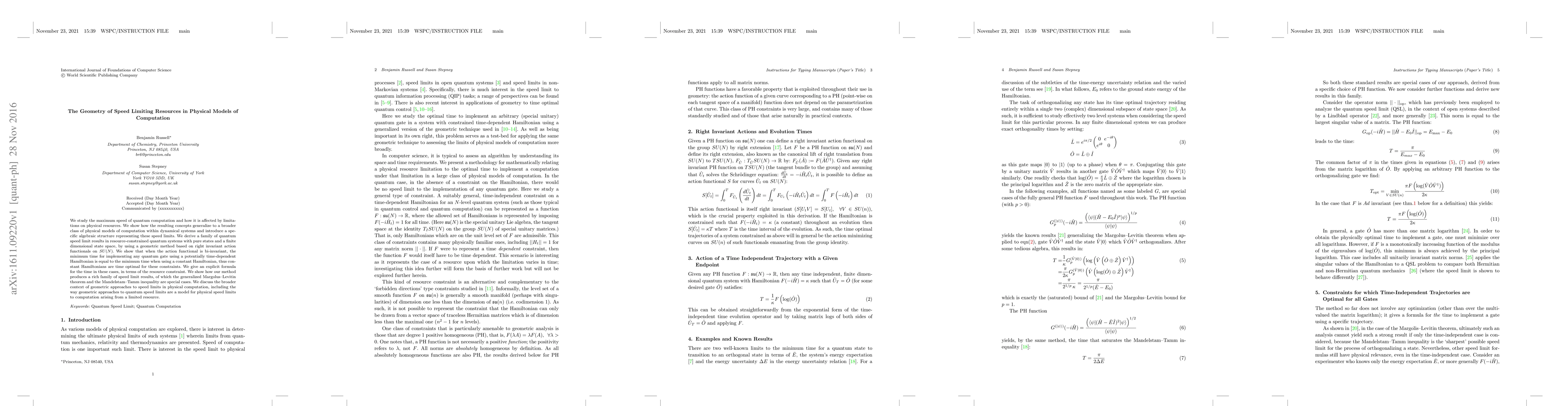 We study the maximum speed of quantum computation and how it is affected by limitations on physical resources. We show how the resulting concepts generalize to a broader class of physical models of computation within dynamical systems and introduce a specific algebraic structure representing these speed limits. We derive a family of quantum speed limit results in resource-constrained quantum systems with pure states and a finite dimensional state space, by using a geometric method based on right invariant action functionals on $SU(N)$. We show that when the action functional is bi-invariant, the minimum time for implementing any quantum gate using a potentially time-dependent Hamiltonian is equal to the minimum time when using a constant Hamiltonian, thus constant Hamiltonians are time optimal for these constraints. We give an explicit formula for the time in these cases, in terms of the resource constraint. We show how our method produces a rich family of speed limit results, of which the generalized Margolus--Levitin theorem and the Mandelstam--Tamm inequality are special cases. We discuss the broader context of geometric approaches to speed limits in physical computation, including the way geometric approaches to quantum speed limits are a model for physical speed limits to computation arising from a limited resource.