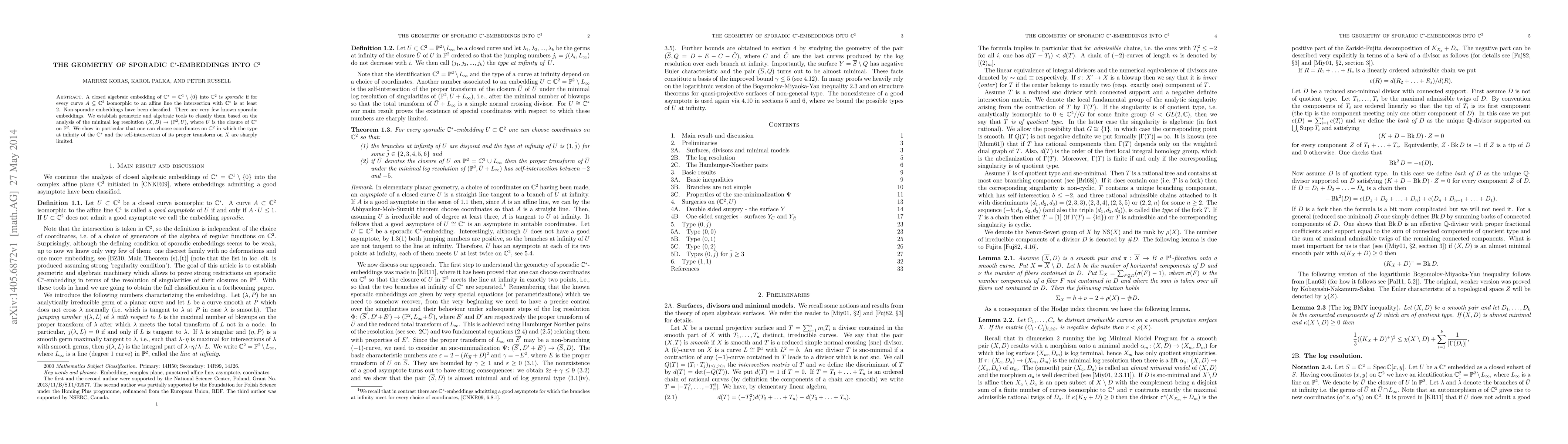 This paper classifies sporadic $\mathbb{C}^*$-embeddings into $\mathbb{C}^2$ using geometric and algebraic tools, focusing on minimal log resolutions. It establishes that these embeddings can be characterized by specific conditions on the intersection with affine lines and the self-intersection on a proper transform.