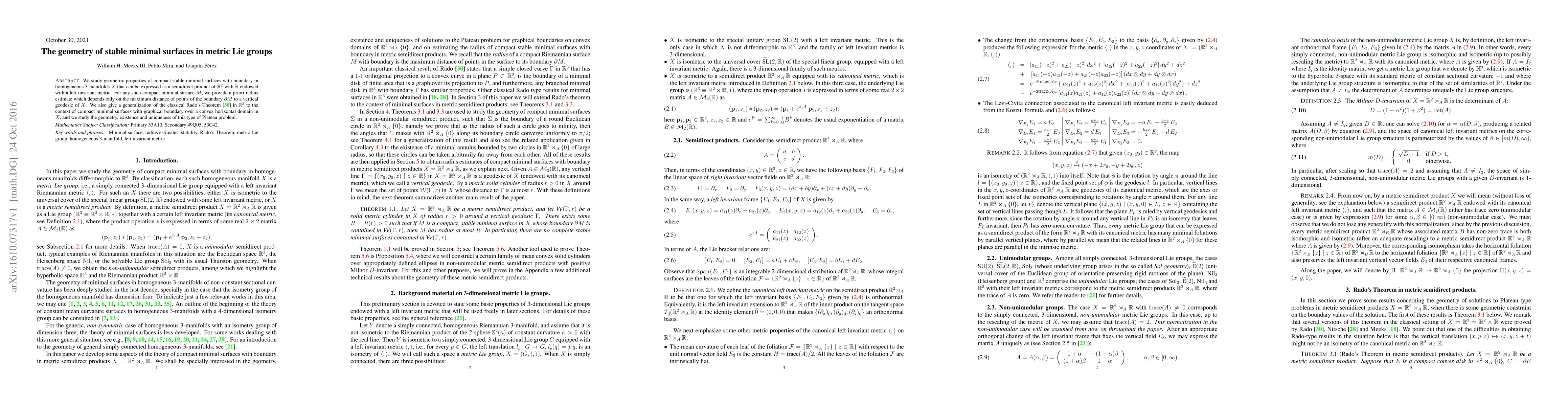 This paper investigates the geometric properties of compact stable minimal surfaces in homogeneous 3-manifolds structured as semidirect products of $\mathbb{R}^2$ with $\mathbb{R}$. It provides an a priori radius estimate for these surfaces based on boundary distances to vertical geodesics and extends Rado's Theorem to this context, exploring the existence and uniqueness of Plateau problems for minimal surfaces with graphical boundary.