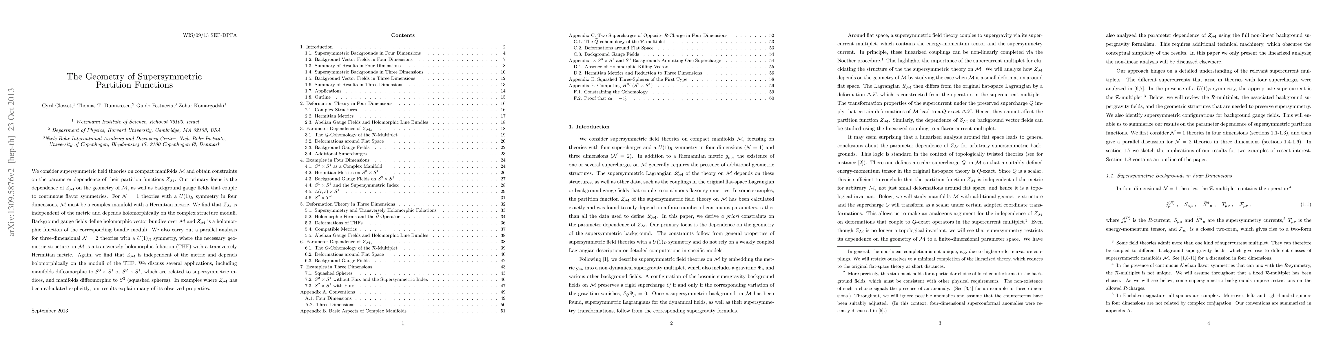 This research explores supersymmetric field theories' partition functions' dependence on manifold geometry and background gauge fields. Key findings include partition functions' independence from metrics for N=1 4D theories on complex manifolds, holomorphic dependence on complex structure moduli, and gauge field effects defining holomorphic vector bundles. Similar results are derived for N=2 3D theories with transversely holomorphic foliations, independent of metrics and holomorphic in THF moduli. Applications cover manifolds like S^3 x S^1, S^2 x S^1, and squashed spheres, explaining many observed properties of explicitly calculated partition functions.