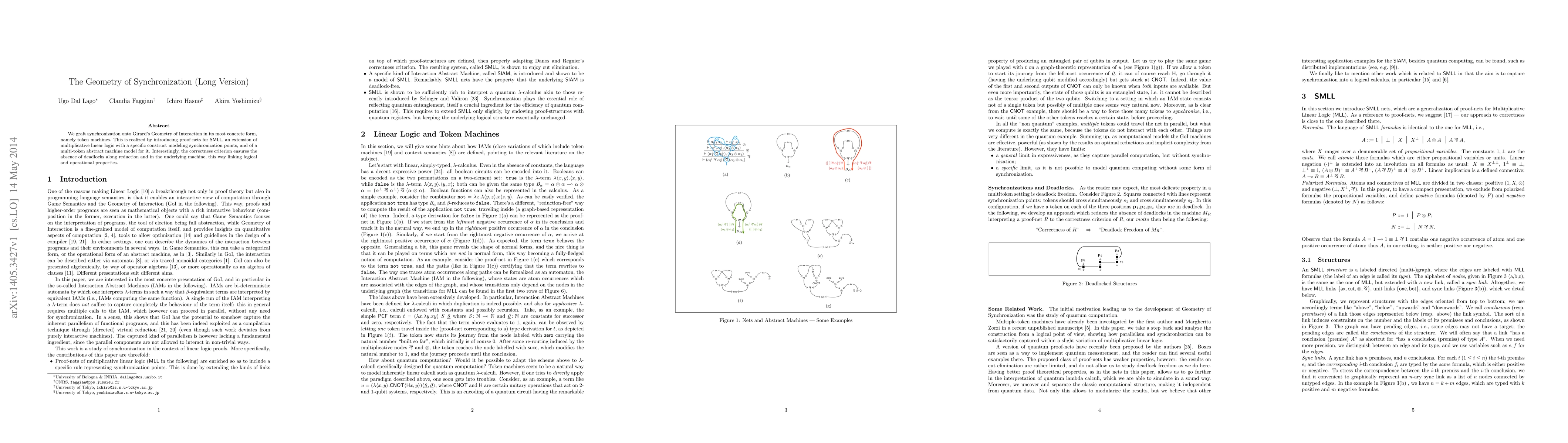This research integrates synchronization into Girard's Geometry of Interaction using token machines. It introduces proof-nets for SMLL, an extended form of multiplicative linear logic with a unique construct for synchronization points, and a multi-token abstract machine model. The method ensures no deadlocks in reduction and the machine, linking logical and operational properties.
