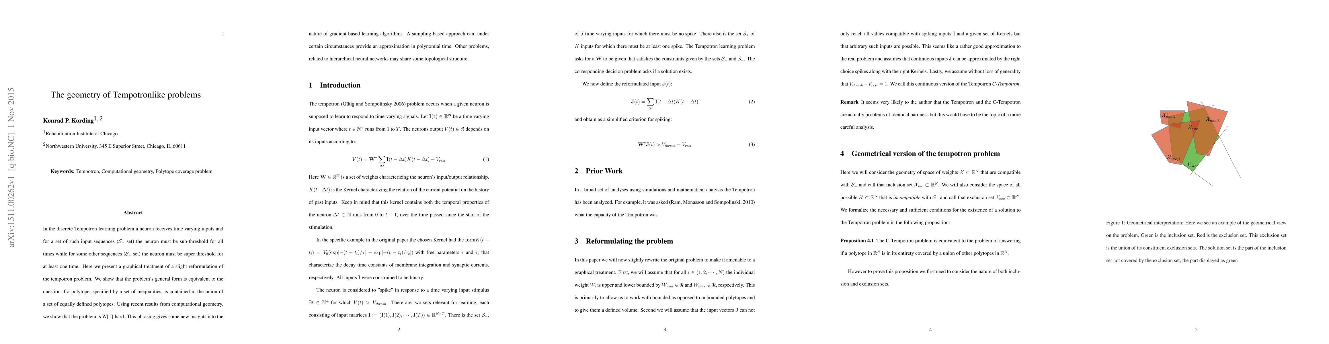 In the discrete Tempotron learning problem a neuron receives time varying inputs and for a set of such input sequences ($\mathcal S_-$ set) the neuron must be sub-threshold for all times while for some other sequences ($\mathcal S_+$ set) the neuron must be super threshold for at least one time. Here we present a graphical treatment of a slight reformulation of the tempotron problem. We show that the problem's general form is equivalent to the question if a polytope, specified by a set of inequalities, is contained in the union of a set of equally defined polytopes. Using recent results from computational geometry, we show that the problem is W[1]-hard. This phrasing gives some new insights into the nature of gradient based learning algorithms. A sampling based approach can, under certain circumstances provide an approximation in polynomial time. Other problems, related to hierarchical neural networks may share some topological structure.