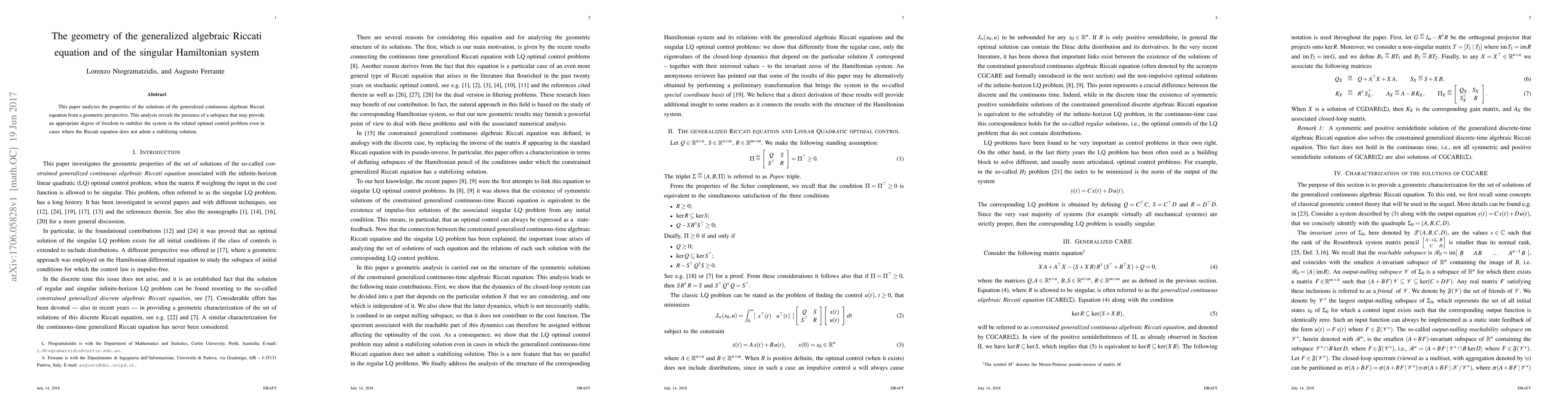 Summary: This paper explores the geometric properties of the generalized algebraic Riccati equation, identifying a stabilizing subspace that offers control freedom even when traditional solutions fail, thus aiding in optimal control stabilization.