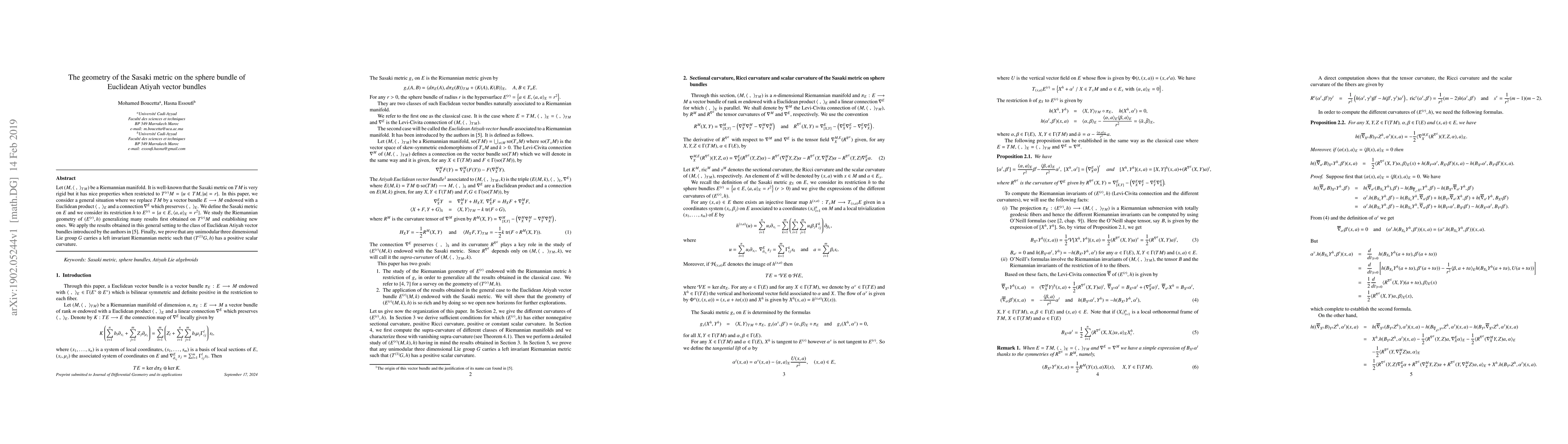 Let $(M,\langle,\rangle_{TM})$ be a Riemannian manifold. It is well-known that the Sasaki metric on $TM$ is very rigid but it has nice properties when restricted to $T^{(r)}M=\{u\in TM,|u|=r \}$. In this paper, we consider a general situation where we replace $TM$ by a vector bundle $E\longrightarrow M$ endowed with a Euclidean product $\langle,\rangle_E$ and a connection $\nabla^E$ which preserves $\langle,\rangle_E$. We define the Sasaki metric on $E$ and we consider its restriction $h$ to $E^{(r)}=\{a\in E,\langle a,a\rangle_E=r^2 \}$. We study the Riemannian geometry of $(E^{(r)},h)$ generalizing many results first obtained on $T^{(r)}M$ and establishing new ones. We apply the results obtained in this general setting to the class of Euclidean Atiyah vector bundles introduced by the authors in arXiv preprint arXiv:1808.01254 (2018). Finally, we prove that any unimodular three dimensional Lie group $G$ carries a left invariant Riemannian metric such that $(T^{(1)}G,h)$ has a positive scalar curvature.