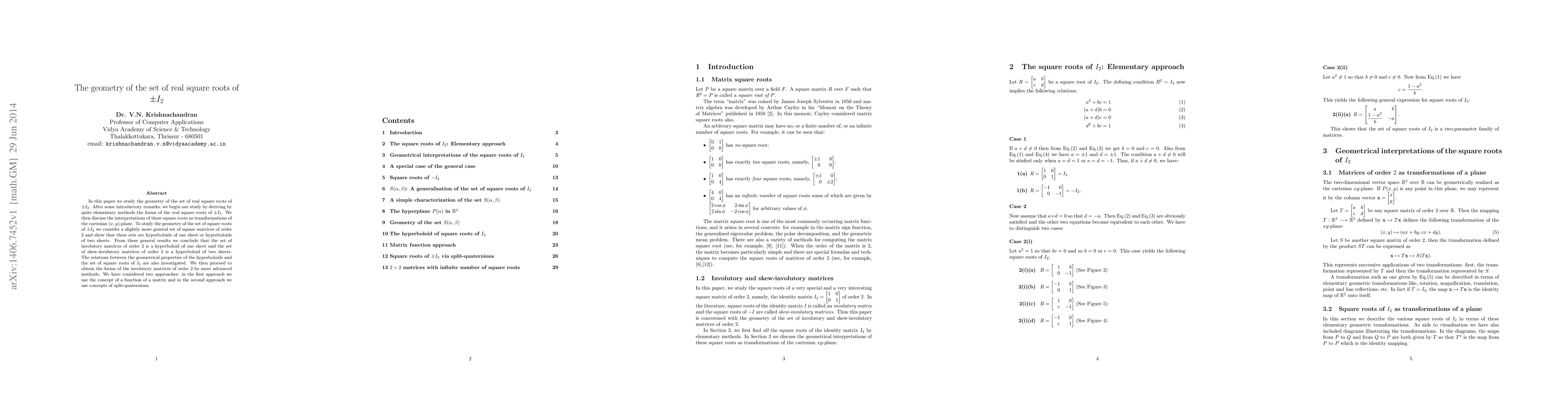 In this paper we study the geometry of the set of real square roots of $\pm I_2$. After some introductory remarks, we begin our study by deriving by quite elementary methods the forms of the real square roots of $\pm I_2$. We then discuss the interpretations of these square roots as transformations of the cartesian $(x,y)$-plane. To study the geometry of the set of square roots of $\pm I_2$ we consider a slightly more general set of square matrices of order $2$ and show that these sets are hyperboloids of one sheet or hyperboloids of two sheets. From these general results we conclude that the set of involutory matrices of order 2 is a hyperboloid of one sheet and the set of skew-involutory matrices of order 2 is a hyperboloid of two sheets. The relations between the geometrical properties of the hyperboloids and the set of square roots of $I_2$ are also investigated. We then proceed to obtain the forms of the involutory matrices of order 2 by more advanced methods. We have considered two approaches: in the first approach we use the concept of a function of a matrix and in the second approach we use concepts of split-quaternions.
