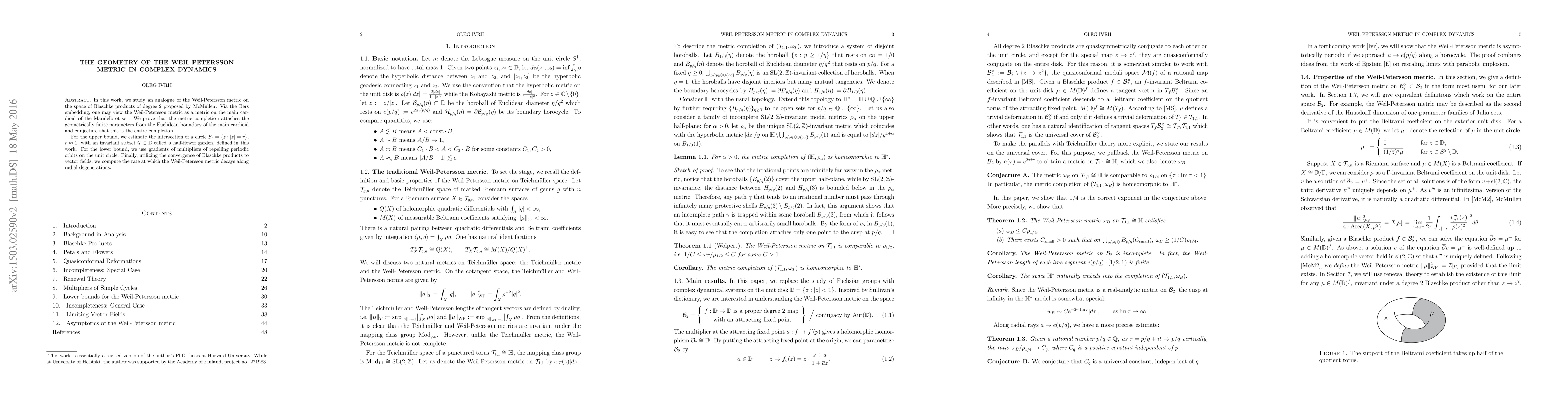 In this work, we study an analogue of the Weil-Petersson metric on the space of Blaschke products of degree 2 proposed by McMullen. Via the Bers embedding, one may view the Weil-Petersson metric as a metric on the main cardioid of the Mandelbrot set. We prove that the metric completion attaches the geometrically finite parameters from the Euclidean boundary of the main cardioid and conjecture that this is the entire completion. For the upper bound, we estimate the intersection of a circle $S_r = \{z : |z| = r\}$, $r \approx 1$, with an invariant subset $\mathcal G \subset \mathbb{D}$ called a half-flower garden, defined in this work. For the lower bound, we use gradients of multipliers of repelling periodic orbits on the unit circle. Finally, utilizing the convergence of Blaschke products to vector fields, we compute the rate at which the Weil-Petersson metric decays along radial degenerations.