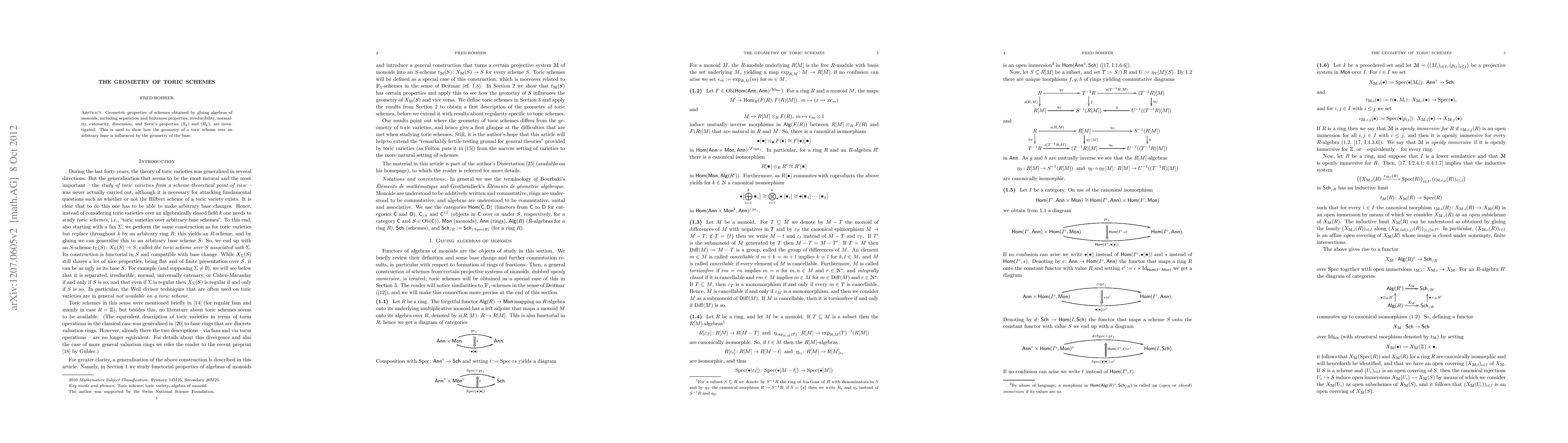 The research investigates geometric properties of schemes obtained by gluing algebras of monoids, focusing on separation and finiteness properties, irreducibility, normality, catenarity, dimension, and Serre's properties (S_k) and (R_k). It explores how the geometry of a toric scheme over an arbitrary base is influenced by the geometry of the base.