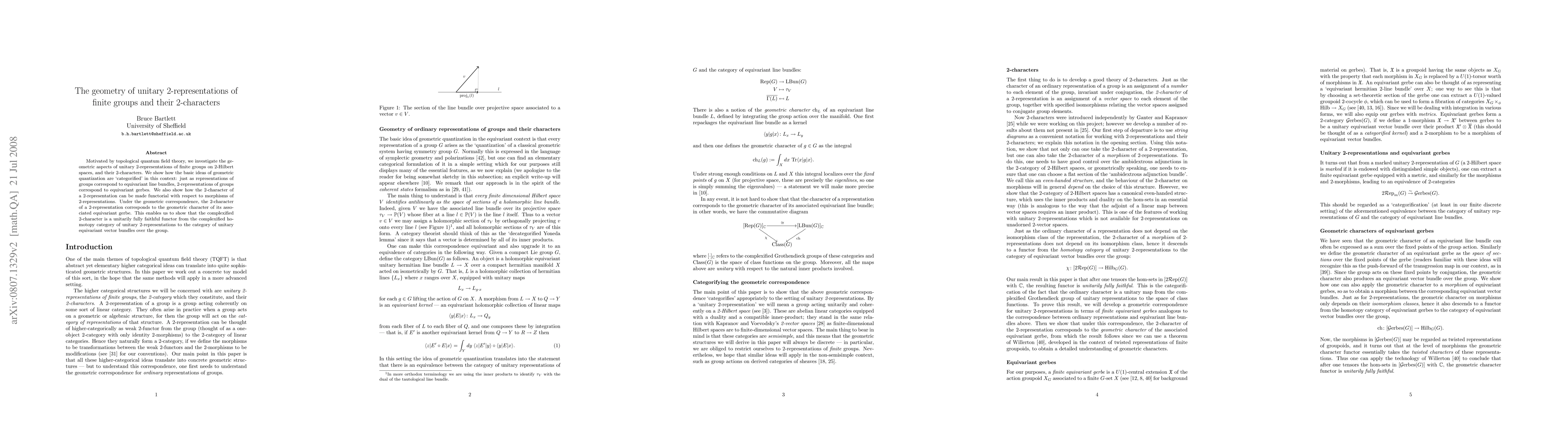 Motivated by topological quantum field theory, we investigate the geometric aspects of unitary 2-representations of finite groups on 2-Hilbert spaces, and their 2-characters. We show how the basic ideas of geometric quantization are `categorified' in this context: just as representations of groups correspond to equivariant line bundles, 2-representations of groups correspond to equivariant gerbes. We also show how the 2-character of a 2-representation can be made functorial with respect to morphisms of 2-representations. Under the geometric correspondence, the 2-character of a 2-representation corresponds to the geometric character of its associated equivariant gerbe. This enables us to show that the complexified 2-character is a unitarily fully faithful functor from the complexified homotopy category of unitary 2-representations to the category of unitary equivariant vector bundles over the group.