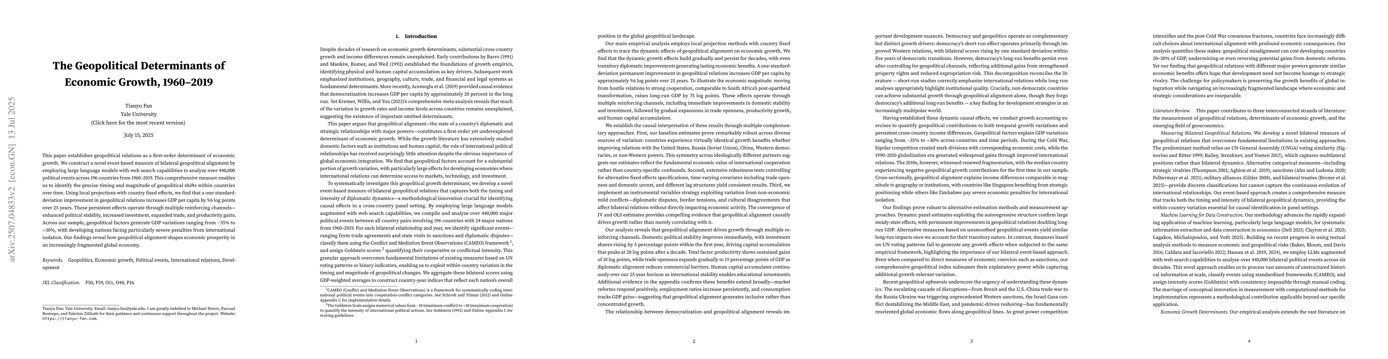 This paper establishes geopolitical relations as a first-order determinant of economic growth. We construct a novel event-based measure of bilateral geopolitical alignment by employing large language models with web search capabilities to analyze over 440,000 political events across 196 countries from 1960--2019. This comprehensive measure enables us to identify the precise timing and magnitude of geopolitical shifts within countries over time. Using local projections with country fixed effects, we find that a one-standard-deviation improvement in geopolitical relations increases GDP per capita by 9.6 log points over 25 years. These persistent effects operate through multiple reinforcing channels -- enhanced political stability, increased investment, expanded trade, and productivity gains. Across our sample, geopolitical factors generate GDP variations ranging from -35% to +30%, with developing nations facing particularly severe penalties from international isolation. Our findings reveal how geopolitical alignment shapes economic prosperity in an increasingly fragmented global economy.