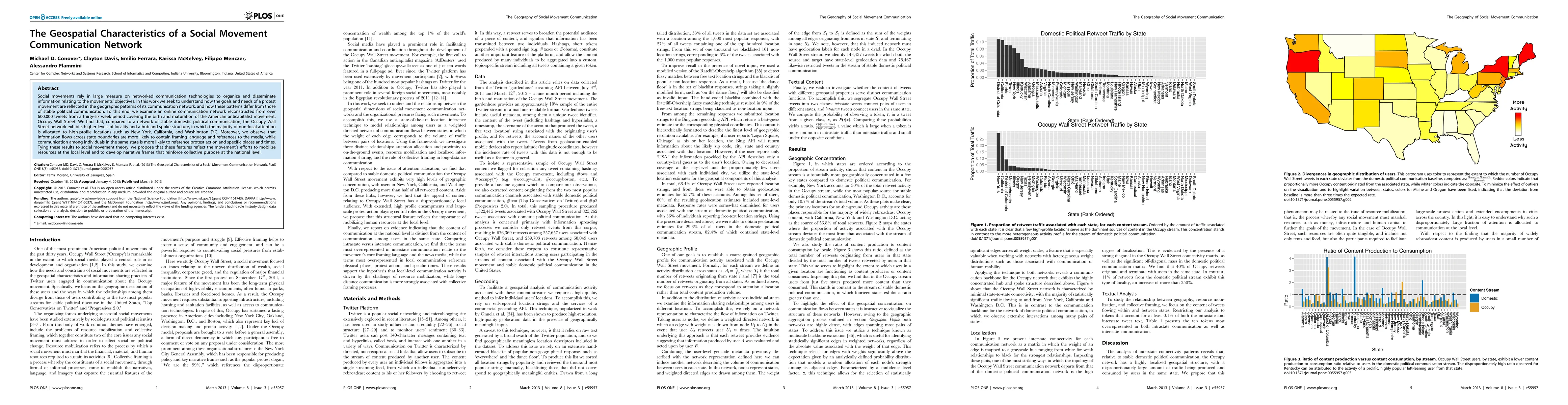 Social movements rely in large measure on networked communication technologies to organize and disseminate information relating to the movements' objectives. In this work we seek to understand how the goals and needs of a protest movement are reflected in the geographic patterns of its communication network, and how these patterns differ from those of stable political communication. To this end, we examine an online communication network reconstructed from over 600,000 tweets from a thirty-six week period covering the birth and maturation of the American anticapitalist movement, Occupy Wall Street. We find that, compared to a network of stable domestic political communication, the Occupy Wall Street network exhibits higher levels of locality and a hub and spoke structure, in which the majority of non-local attention is allocated to high-profile locations such as New York, California, and Washington D.C. Moreover, we observe that information flows across state boundaries are more likely to contain framing language and references to the media, while communication among individuals in the same state is more likely to reference protest action and specific places and and times. Tying these results to social movement theory, we propose that these features reflect the movement's efforts to mobilize resources at the local level and to develop narrative frames that reinforce collective purpose at the national level.