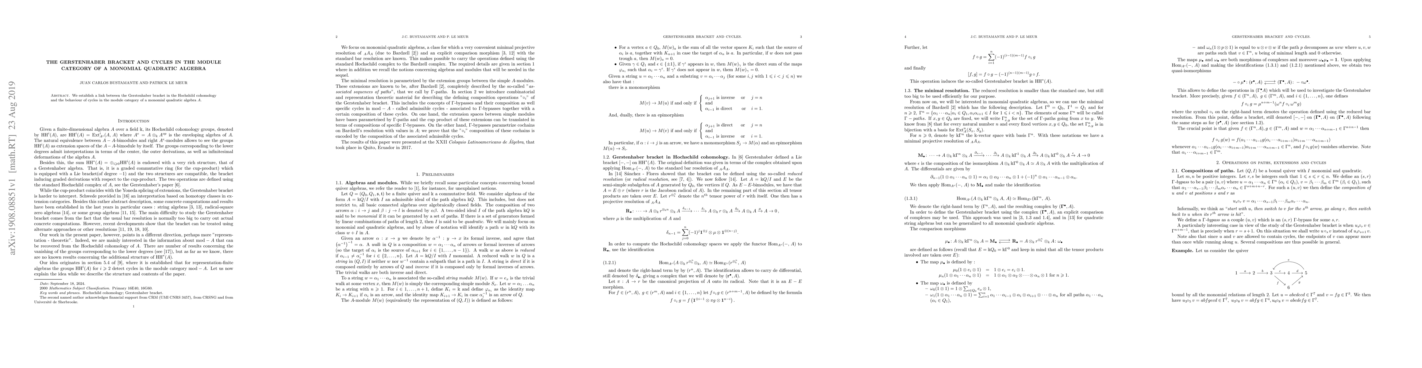 Researchers establish a connection between the Gerstenhaber bracket in Hochschild cohomology and cycles in the module category of monomial quadratic algebras, shedding light on their behavior and implications.