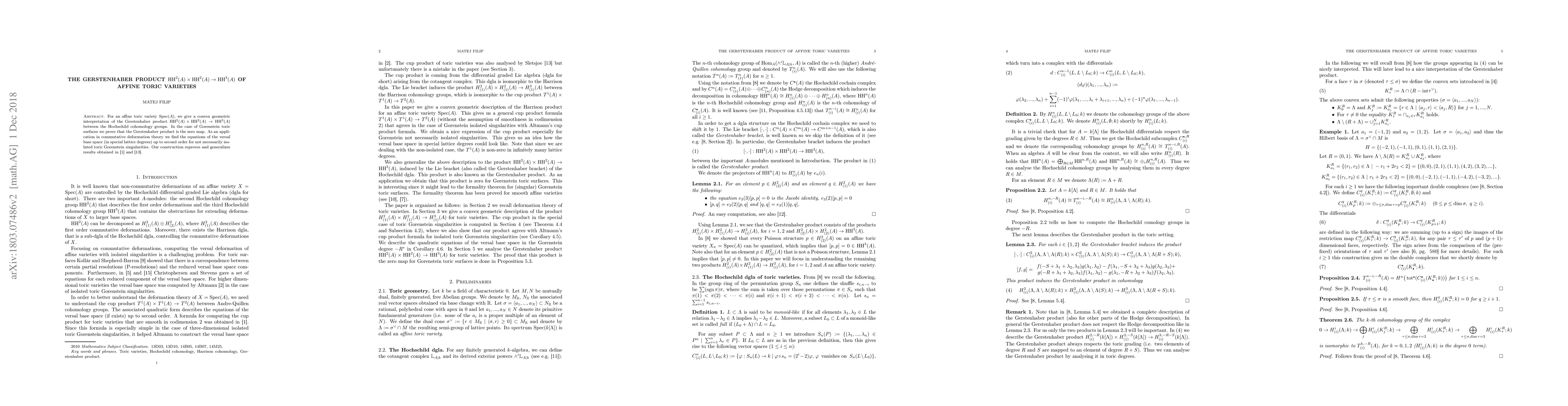 For an affine toric variety $\spec(A)$, we give a convex geometric interpretation of the Gerstenhaber product $\HH^2(A)\times \HH^2(A)\to \HH^3(A)$ between the Hochschild cohomology groups. In the case of Gorenstein toric surfaces we prove that the Gerstenhaber product is the zero map. As an application in commutative deformation theory we find the equations of the versal base space (in special lattice degrees) up to second order for not necessarily isolated toric Gorenstein singularities. Our construction reproves and generalizes results obtained in [1] and [13].