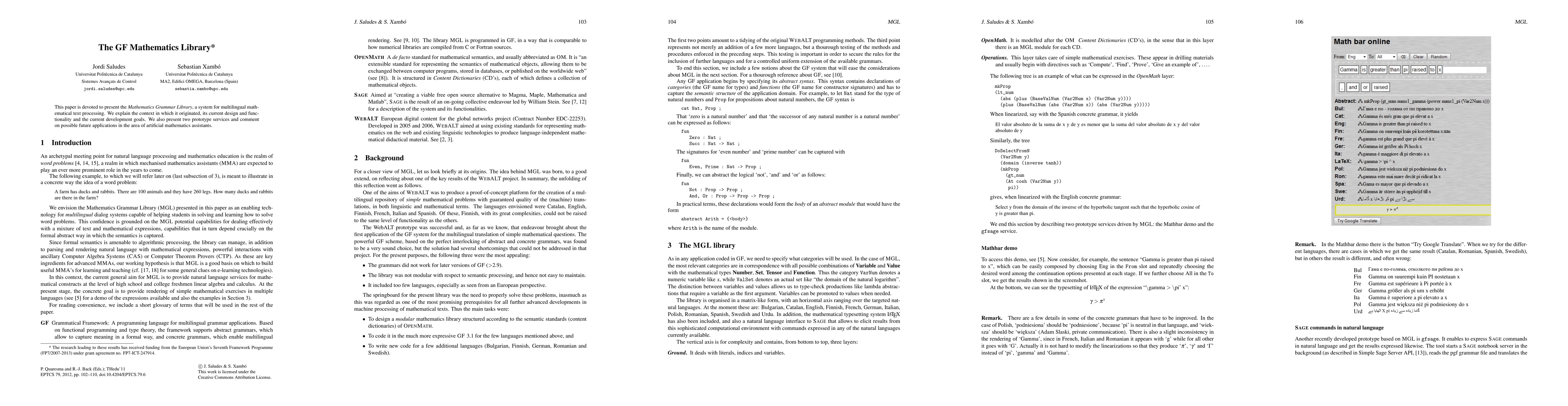 The Mathematics Grammar Library is a multilingual system for processing mathematical texts, designed to support artificial mathematics assistants and featuring two prototype services. Its development aims to enhance multilingual mathematical text processing.