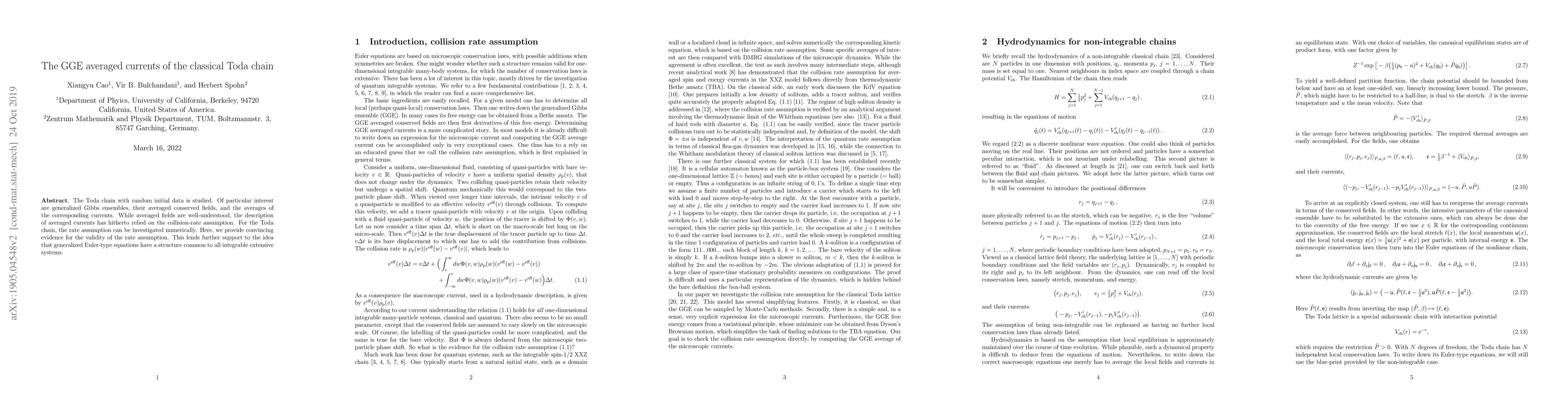 The Toda chain with random initial data is studied. Of particular interest are generalized Gibbs ensembles, their averaged conserved fields, and the averages of the corresponding currents. While averaged fields are well-understood, the description of averaged currents has hitherto relied on the collision-rate assumption. For the Toda chain, the rate assumption can be investigated numerically. Here, we provide convincing evidence for the validity of the rate assumption. This lends further support to the idea that generalized Euler-type equations have a structure common to all integrable extensive systems.