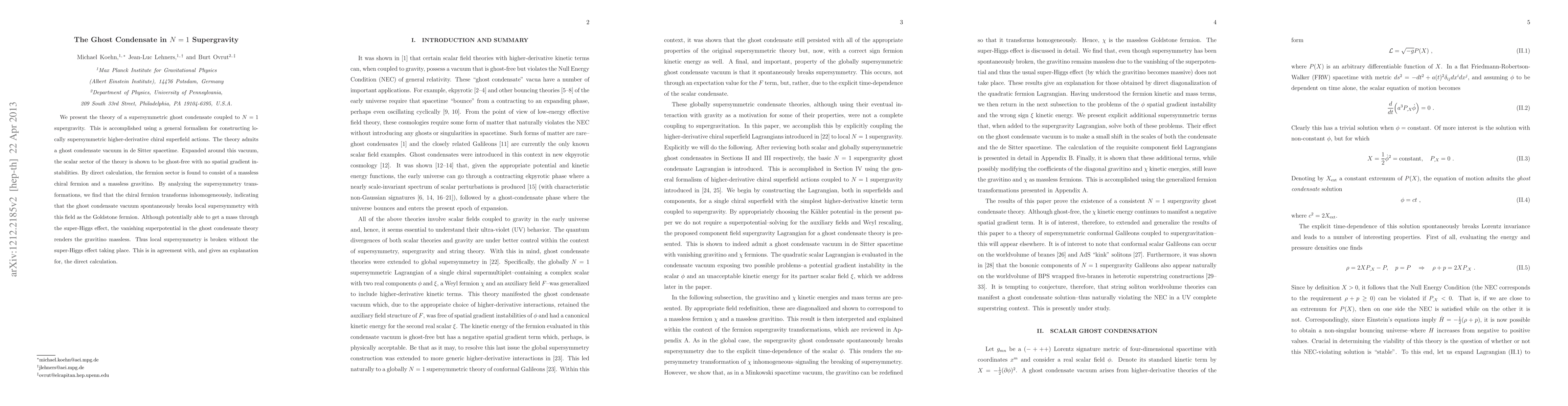This paper develops a supersymmetric ghost condensate theory in N=1 supergravity, demonstrating a ghost-free scalar sector and a massless chiral fermion and gravitino. The vacuum spontaneously breaks local supersymmetry without the super-Higgs mechanism, as indicated by the inhomogeneous transformation of the chiral fermion.