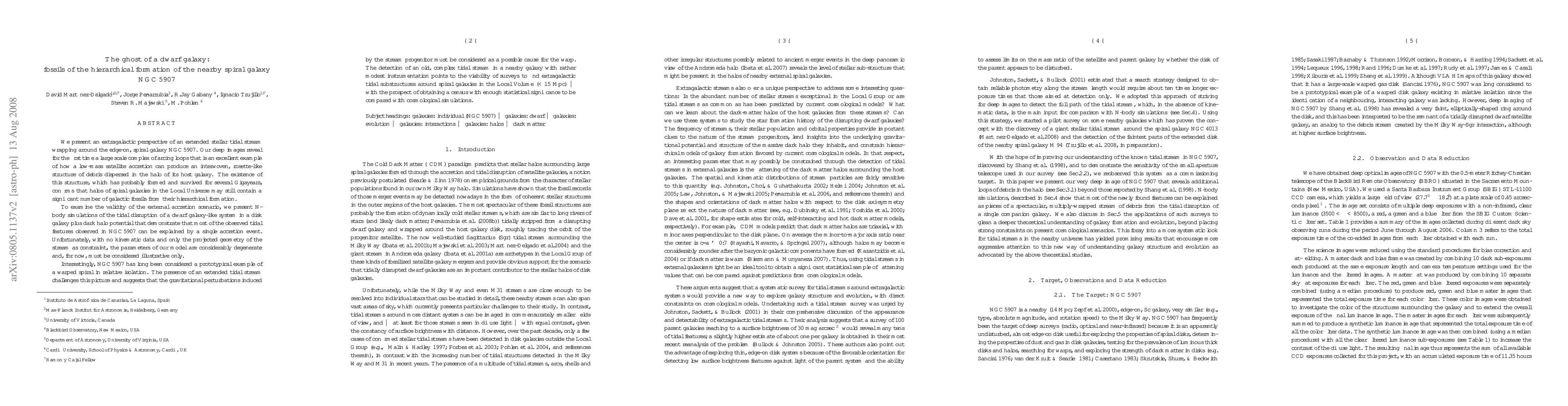 This paper reveals an extended stellar tidal stream around NGC 5907, indicating the accretion of a dwarf galaxy and forming a rosette-like structure in the galaxy's halo, suggesting significant galactic fossils from hierarchical formation. N-body simulations support the single accretion event scenario but lack kinematic data, limiting model precision.