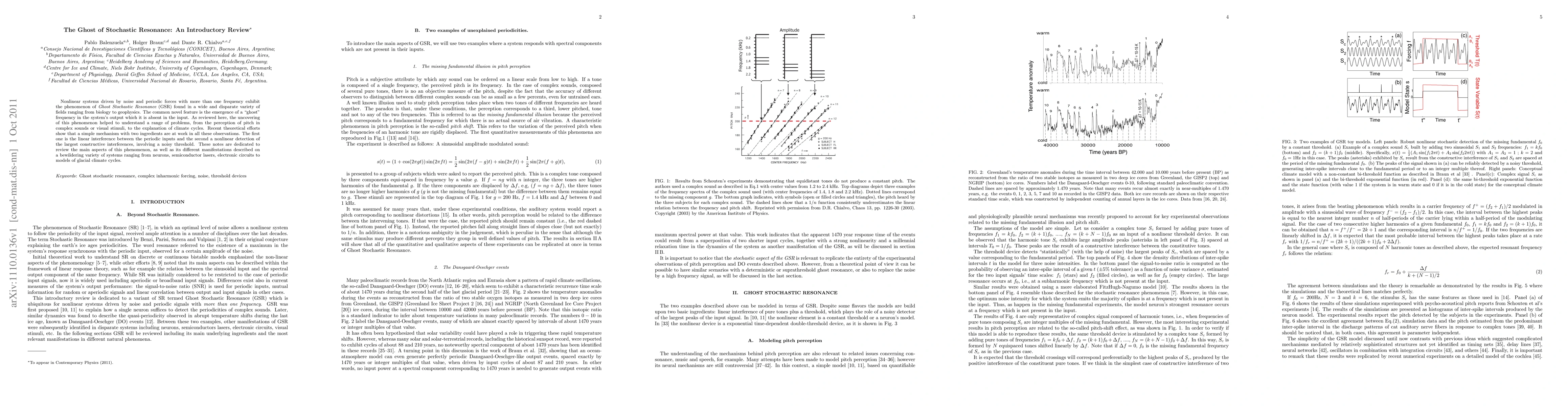 Nonlinear systems driven by noise and periodic forces with more than one frequency exhibit the phenomenon of Ghost Stochastic Resonance (GSR) found in a wide and disparate variety of fields ranging from biology to geophysics. The common novel feature is the emergence of a "ghost" frequency in the system's output which it is absent in the input. As reviewed here, the uncovering of this phenomenon helped to understand a range of problems, from the perception of pitch in complex sounds or visual stimuli, to the explanation of climate cycles. Recent theoretical efforts show that a simple mechanism with two ingredients are at work in all these observations. The first one is the linear interference between the periodic inputs and the second a nonlinear detection of the largest constructive interferences, involving a noisy threshold. These notes are dedicated to review the main aspects of this phenomenon, as well as its different manifestations described on a bewildering variety of systems ranging from neurons, semiconductor lasers, electronic circuits to models of glacial climate cycles.