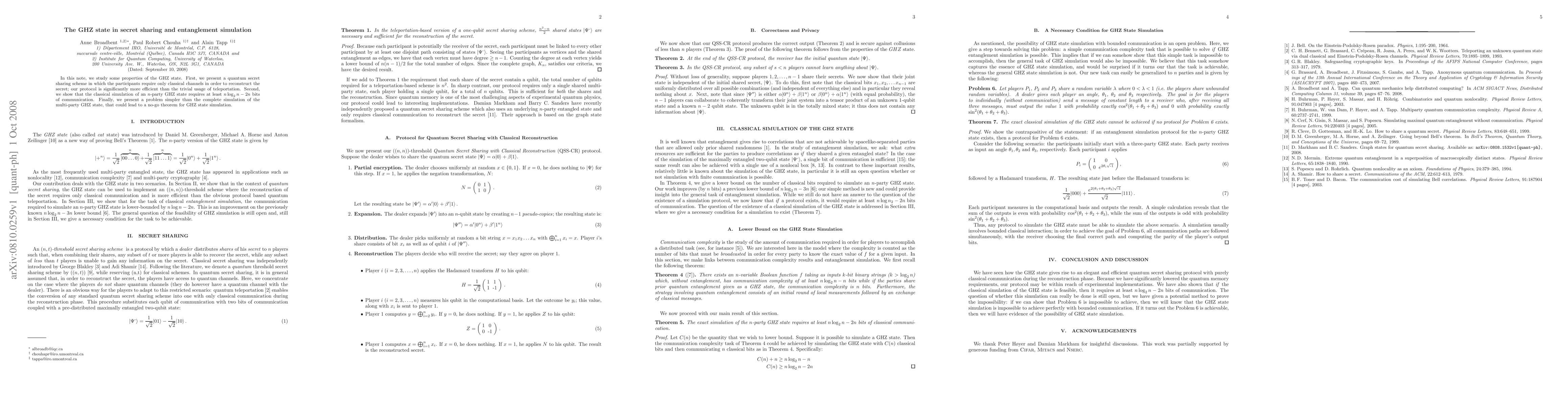 In this note, we study some properties of the GHZ state. First, we present a quantum secret sharing scheme in which the participants require only classical channels in order to reconstruct the secret; our protocol is significantly more efficient than the trivial usage of teleportation. Second, we show that the classical simulation of an n-party GHZ state requires at least n log n - 2n bits of communication. Finally, we present a problem simpler than the complete simulation of the multi-party GHZ state, that could lead to a no-go theorem for GHZ state simulation.
