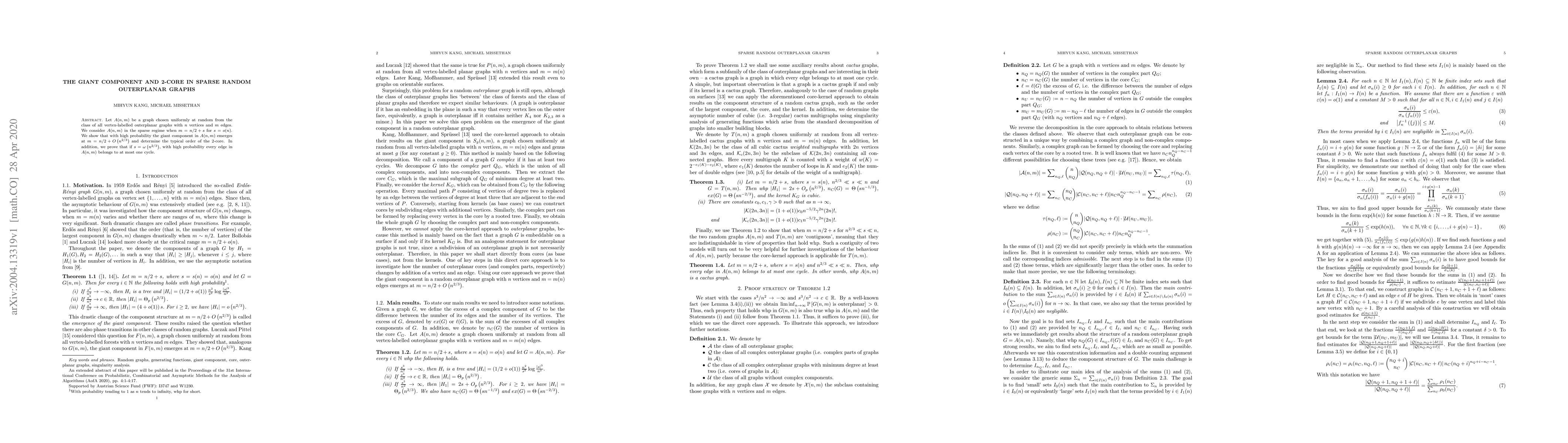 This research investigates sparse random outerplanar graphs, demonstrating that a giant component forms at m=n/2+O(n^(2/3)) and determining the 2-core's typical size. It also proves edges are predominantly acyclic when s=ω(n^(2/3)), offering insights into graph structure and properties in specific random graph models.