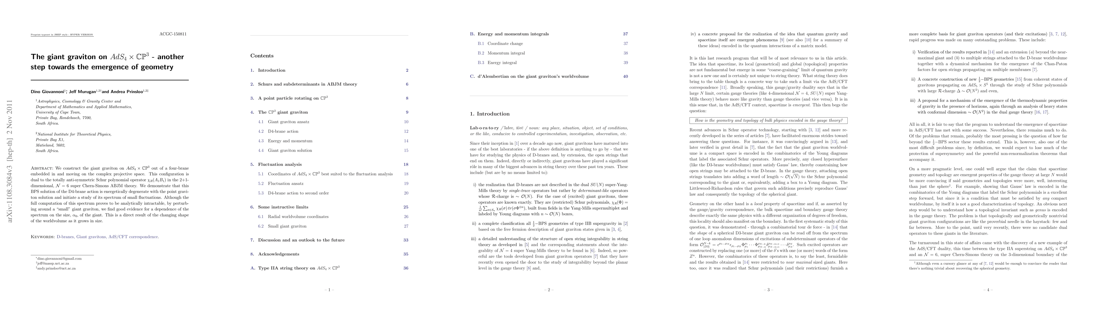 We construct the giant graviton on AdS_{4} x CP^{3} out of a four-brane embedded in and moving on the complex projective space. This configuration is dual to the totally anti-symmetric Schur polynomial operator \chi_{R}(A_{1}B_{1}) in the 2+1-dimensional, N = 6 super Chern-Simons ABJM theory. We demonstrate that this BPS solution of the D4-brane action is energetically degenerate with the point graviton solution and initiate a study of its spectrum of small fluctuations. Although the full computation of this spectrum proves to be analytically intractable, by perturbing around a "small'" giant graviton, we find good evidence for a dependence of the spectrum on the size, \alpha_{0}, of the giant. This is a direct result of the changing shape of the worldvolume as it grows in size.