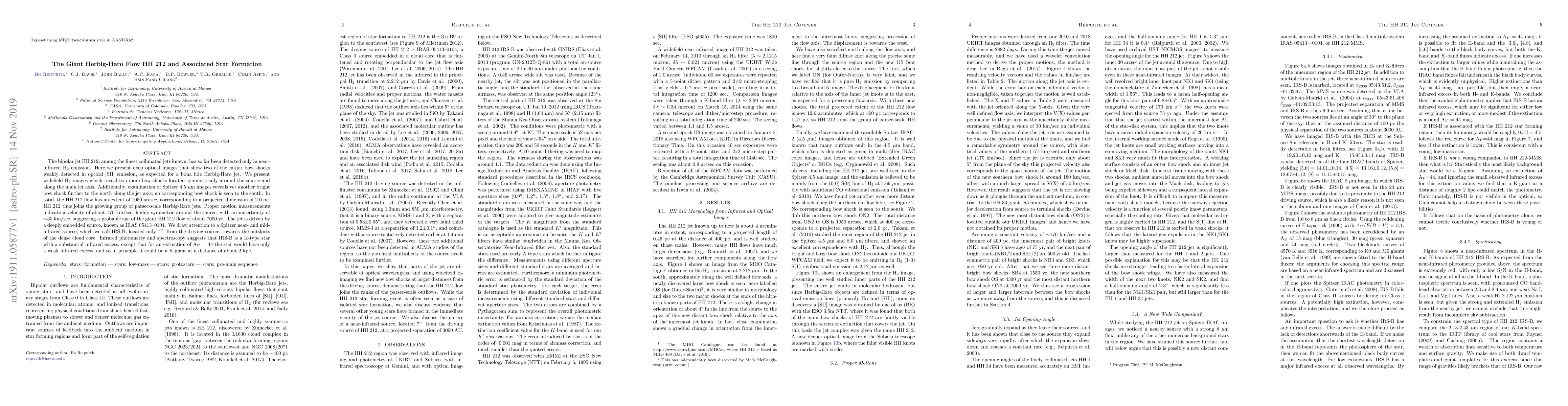 The bipolar jet HH 212, among the finest collimated jets known, has so far been detected only in near-infrared H$_2$ emission. Here we present deep optical images that show two of the major bow shocks weakly detected in optical [SII] emission, as expected for a bona fide Herbig-Haro jet. We present widefield H$_2$ images which reveal two more bow shocks located symmetrically around the source and along the main jet axis. Additionally, examination of Spitzer 4.5 $\mu$m images reveals yet another bright bow shock further to the north along the jet axis; no corresponding bow shock is seen to the south. In total, the HH 212 flow has an extent of 1050 arcsec, corresponding to a projected dimension of 2.0 pc. HH 212 thus joins the growing group of parsec-scale Herbig-Haro jets. Proper motion measurements indicate a velocity of about 170 km/sec, highly symmetric around the source, with an uncertainty of $\sim$30 km/sec, suggesting a probable age of the giant HH 212 flow of about 7000 yr. The jet is driven by a deeply embedded source, known as IRAS 05413-0104. We draw attention to a Spitzer near- and mid-infrared source, which we call IRS-B, located only 7 arcsec from the driving source, towards the outskirts of the dense cloud core. Infrared photometry and spectroscopy suggests that IRS-B is a K-type star with a substantial infrared excess, except that for an extinction of A$_V$ = 44 the star would have only a weakinfrared excess, and so in principle it could be a K-giant at a distance of about 2 kpc.