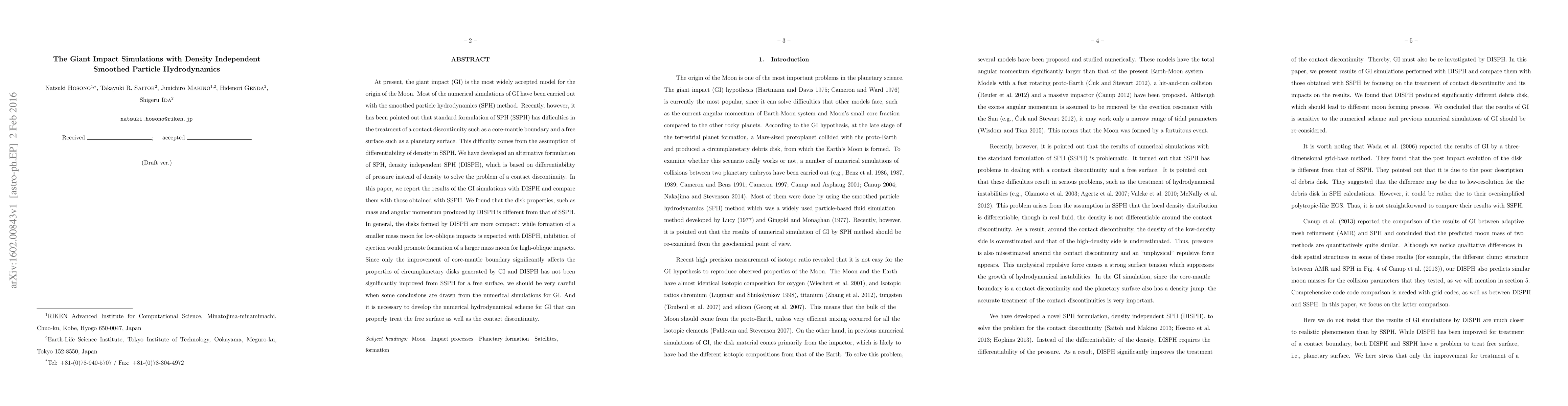 This paper presents simulations of the giant impact model for the Moon's origin using a new density-independent smoothed particle hydrodynamics (DISPH) method, which addresses issues in standard SPH (SSPH) related to contact discontinuities. DISPH produces more compact disks compared to SSPH, suggesting different outcomes for moon formation depending on impact angles. However, improvements in treating free surfaces are still needed.