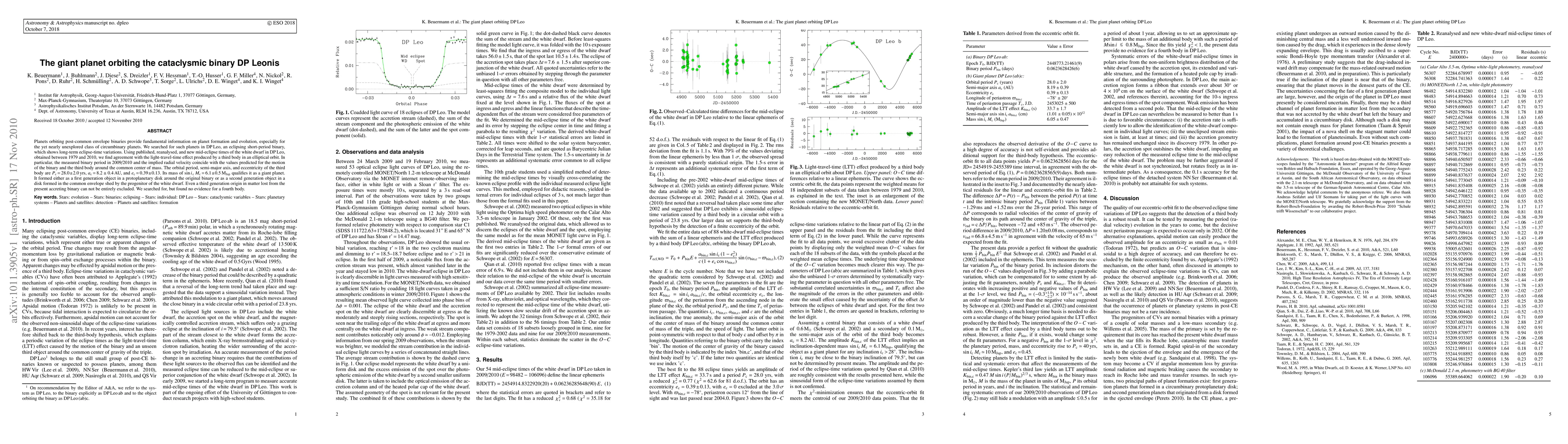 Planets orbiting post-common envelope binaries provide fundamental information on planet formation and evolution, especially for the yet nearly unexplored class of circumbinary planets. We searched for such planets in \odp, an eclipsing short-period binary, which shows long-term eclipse-time variations. Using published, reanalysed, and new mid-eclipse times of the white dwarf in DP\,Leo, obtained between 1979 and 2010, we find agreement with the light-travel-time effect produced by a third body in an elliptical orbit. In particular, the measured binary period in 2009/2010 and the implied radial velocity coincide with the values predicted for the motion of the binary and the third body around the common center of mass. The orbital period, semi-major axis, and eccentricity of the third body are P_c = 28.0 +/- 2.0 yrs, a_c = 8.2 +/- 0.4 AU, and e_c = 0.39 +/- 0.13. Its mass of M_c sin(i_c) = 6.1 +/- 0.5 M_J qualifies it as a giant planet. It formed either as a first generation object in a protoplanetary disk around the original binary or as a second generation object in a disk formed in the common envelope shed by the progenitor of the white dwarf. Even a third generation origin in matter lost from the present accreting binary can not be entirely excluded. We searched for, but found no evidence for a fourth body.