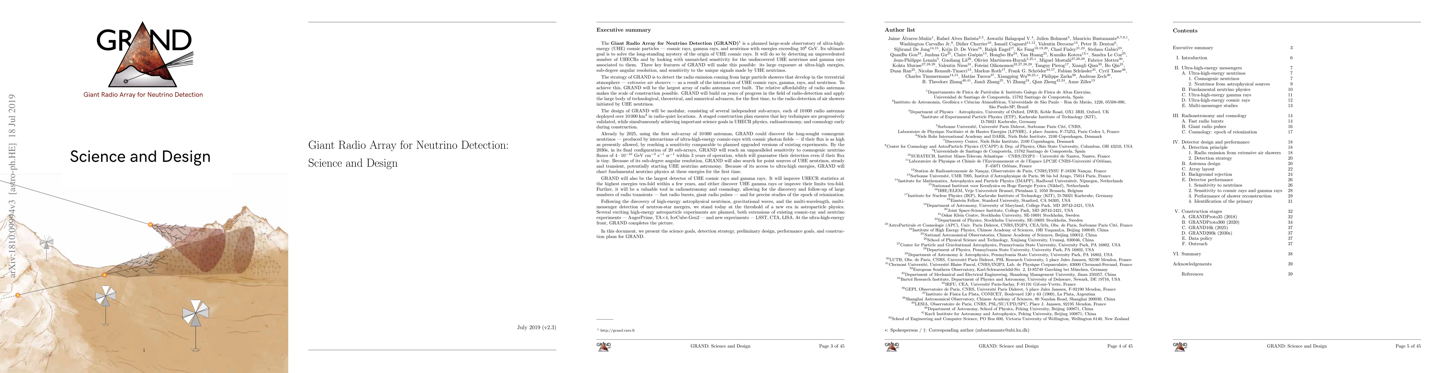 The Giant Radio Array for Neutrino Detection (GRAND) aims to solve the mystery of ultra-high-energy cosmic rays by detecting unprecedented numbers of UHE particles and their associated neutrinos and gamma rays. GRAND will use large arrays of antennas to detect radio emission from air showers, with a modular design to achieve science goals early through staged construction.