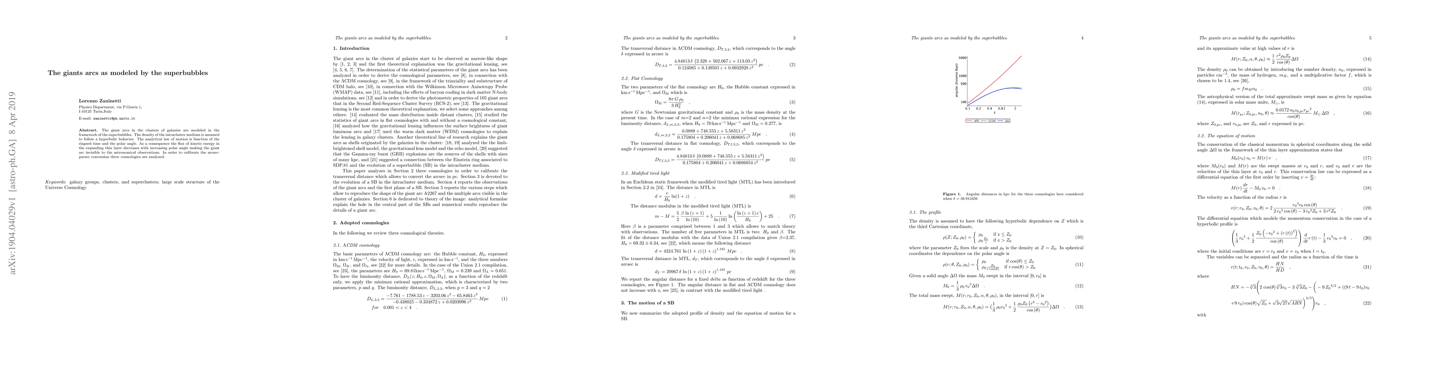 The giant arcs in the clusters of galaxies are modeled in the framework of the superbubbles. The density of the intracluster medium is assumed to follow a hyperbolic behavior. The analytical law of motion is function of the elapsed time and the polar angle. As a consequence the flux of kinetic energy in the expanding thin layer decreases with increasing polar angle making the giant arc invisible to the astronomical observations. In order to calibrate the arcsec-parsec conversion three cosmologies are analyzed.