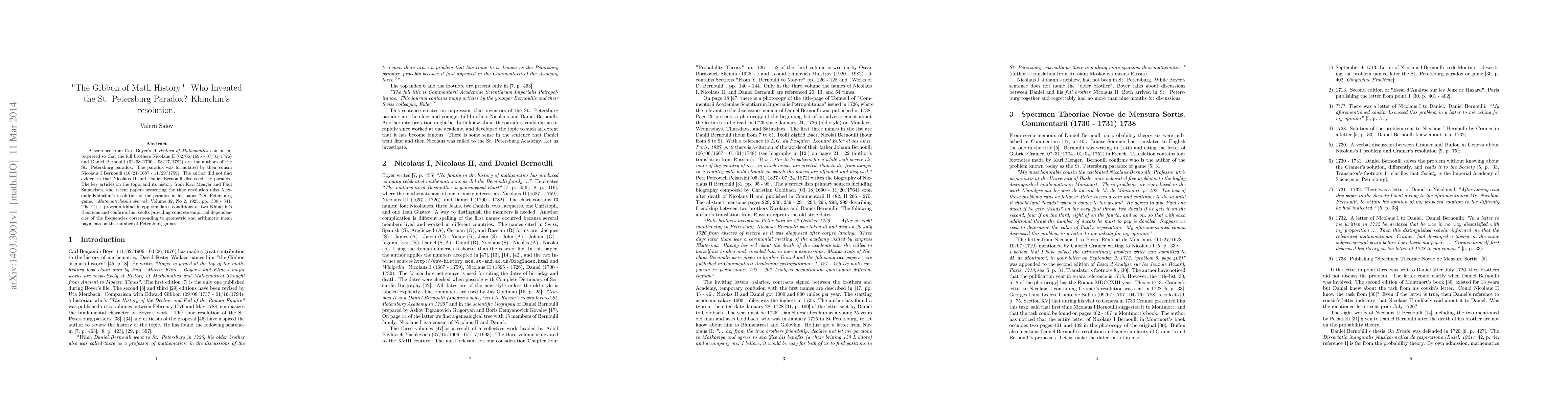 A sentence from Carl Boyer's A History of Mathematics can be interpreted so that the full brothers Nicolaus II (02/06/1695 - 07/31/1726) and Daniel Bernoulli (02/08/1700 - 03/17/1782) are the authors of the St. Petersburg paradox. The paradox was formulated by their cousin Nicolaus I Bernoulli (10/21/1687 - 11/29/1759). The author did not find evidences that Nicolaus II and Daniel Bernoulli discussed the paradox. The key articles on the topic and its history from Karl Menger and Paul Samuelson, and recent papers presenting the time resolution miss Alexandr Khinchin's resolution of the paradox in his paper "On Petersburg game." Matematicheskii sbornik, Volume 32, No 2, 1925, pp. 330 - 341. The C++ program khinchin.cpp simulates conditions of two Khinchin's theorems and confirms his results providing concrete empirical dependencies of the frequencies corresponding to geometric and arithmetic mean payments on the number of Petersburg games.